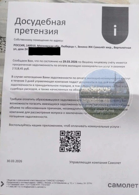 УК "Самолет" начал отправлять досудебные претензии по просроченной задолженности по оплате коммунальных услуг.