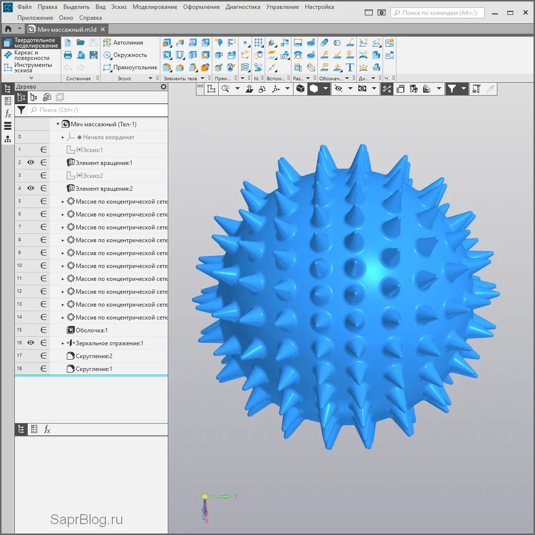 3. Размножение шипов: Здесь начинается самое интересное — несколько операций «Массив по концентрической сетке». Эта команда создает копии объекта (шипа) по кругу и радиально, что идеально подходит для шарообразной формы.