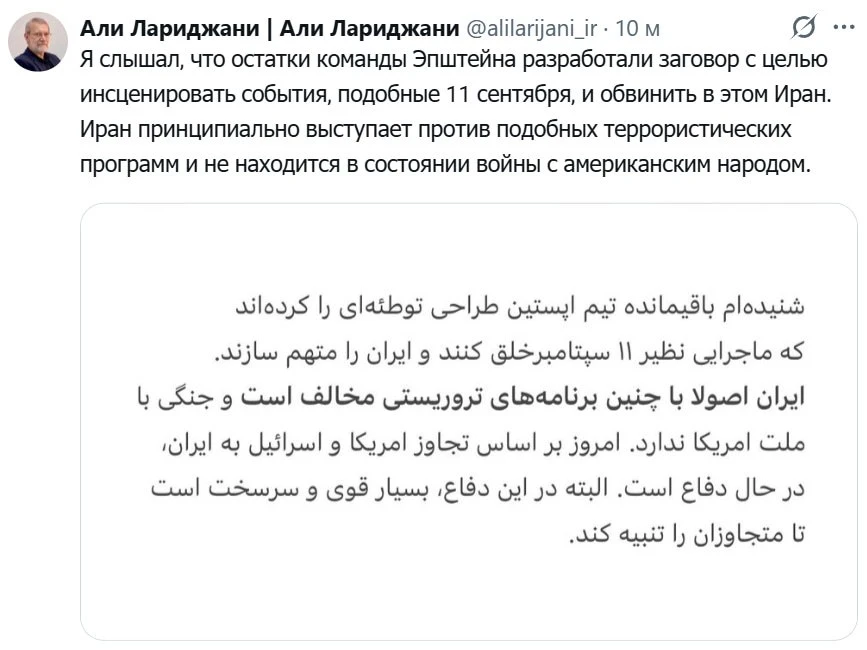 ⚡️США планируют устроить инцидент, подобный событиям 11 сентября, и обвинить в этом Иран, — секретарь Совета нацбезопасности Ирана Али Лариджани.