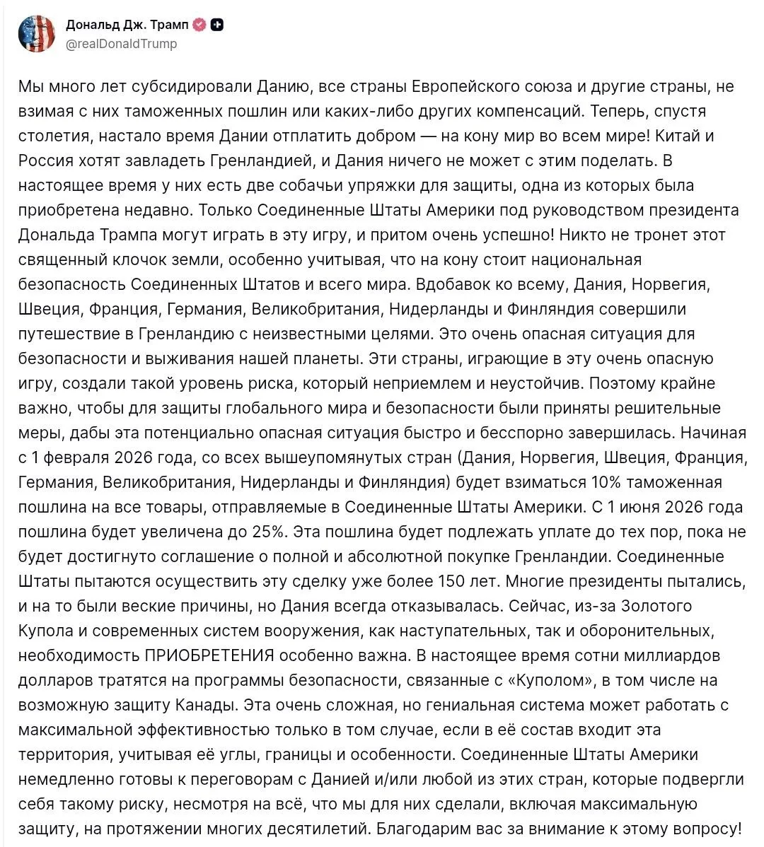 ⚡️Трамп ввел пошлины в размере 10% против ряда европейских стран, которые направили своих военных в Гренландию: