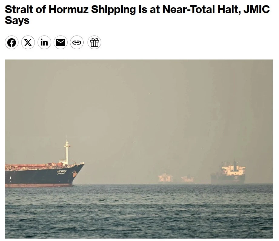 ⚡️Судоходство в Ормузском проливе почти полностью остановилось, — Bloomberg.
