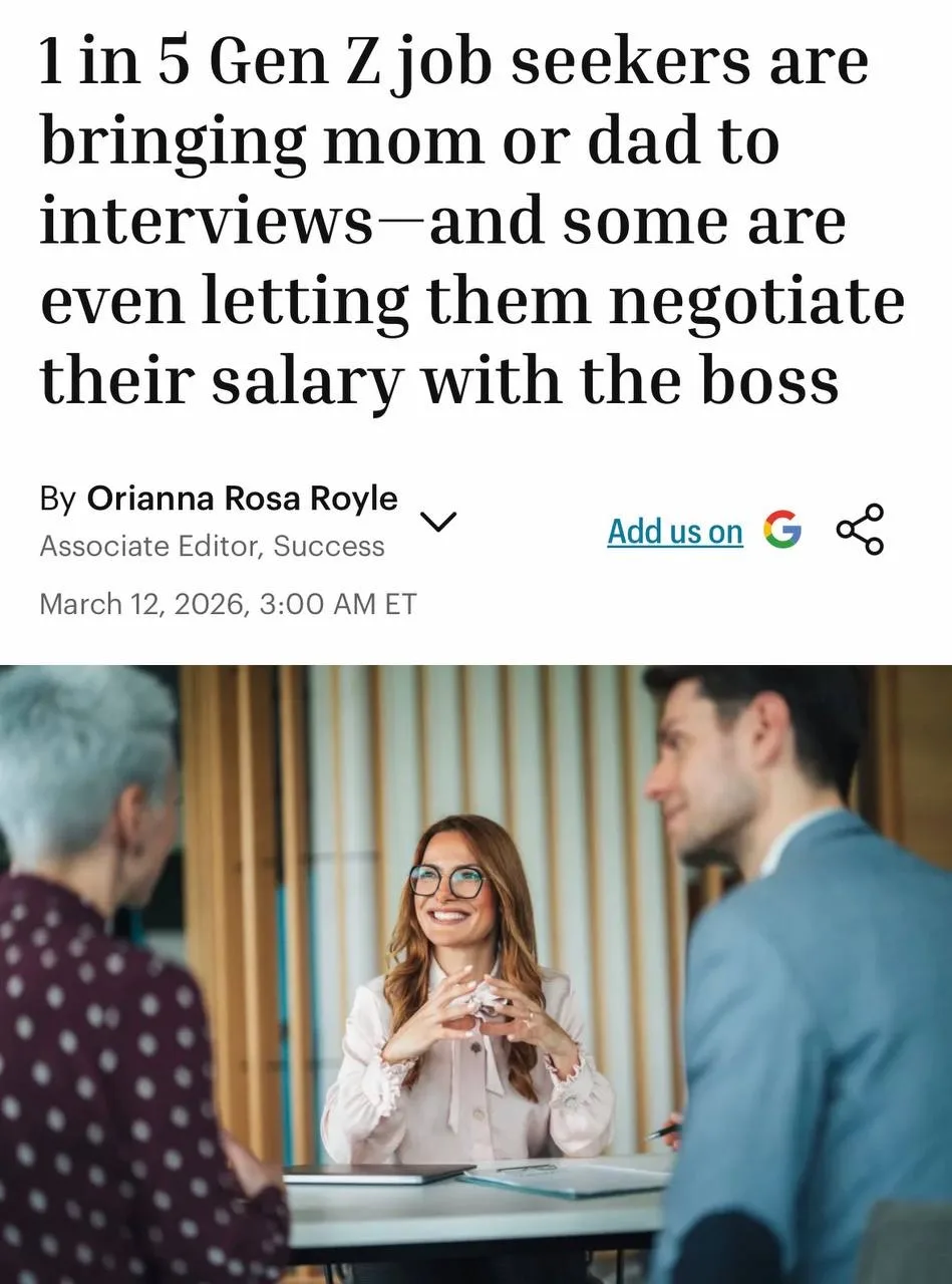 Каждый пятый зумер приходит на собеседование вместе с родителями, пишет Fortune. Отцы или матери нередко выступают переговорщиками и обсуждают будущую зарплату без участия самого кандидата, а после трудоустройства более половины родителей продолжают приезжать в офис и проверять условия работы.