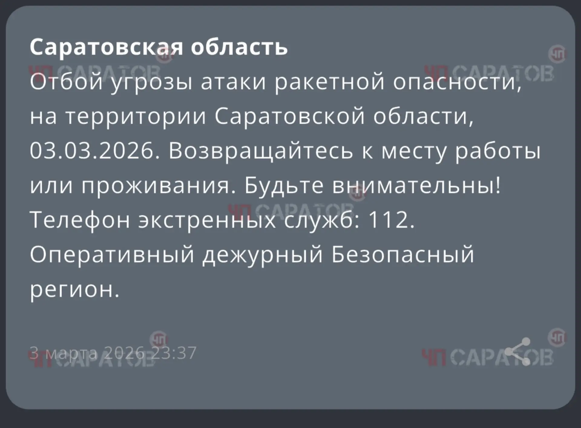 ❗️Отбой угрозы атаки ракетной опасности, на территории Саратовской области.