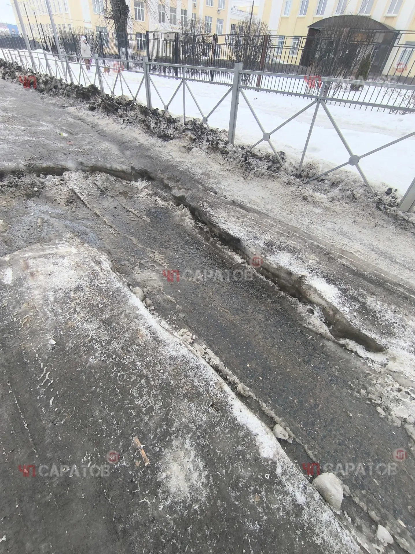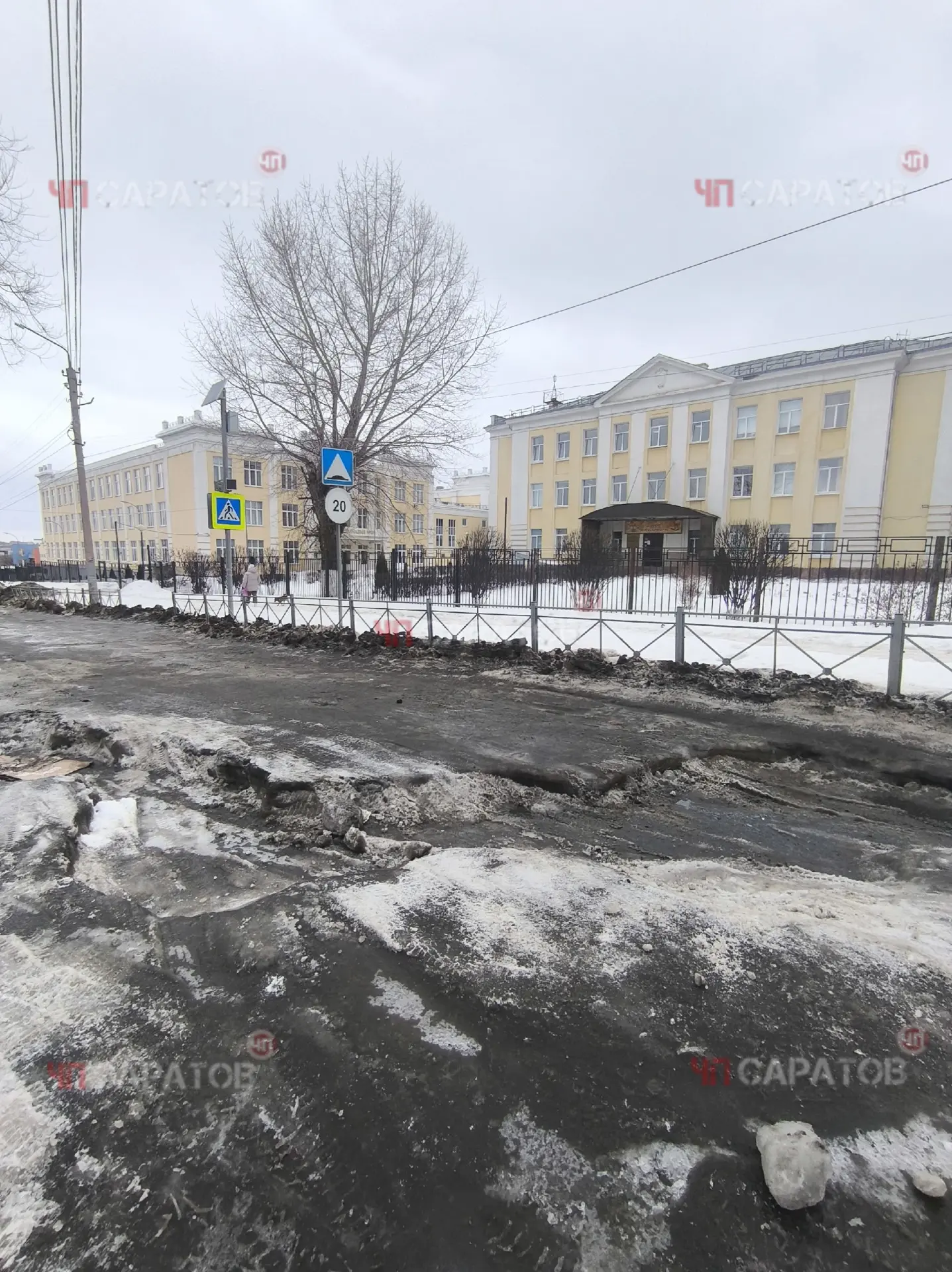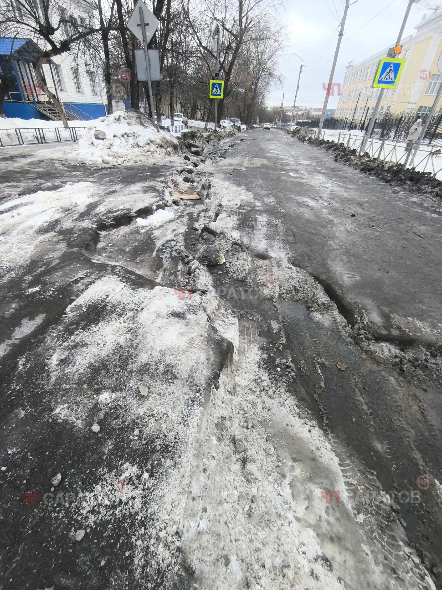 Малая Елшанская 7 , напротив гимназии 89 проезда нет по центральной дороги.Люди не могут проехать и подвезти своих детей в школу, глыбы из льда около 35см,промоины.