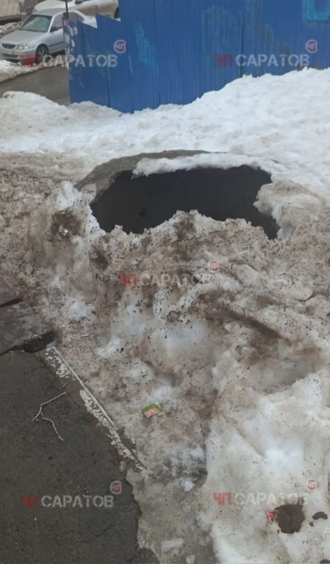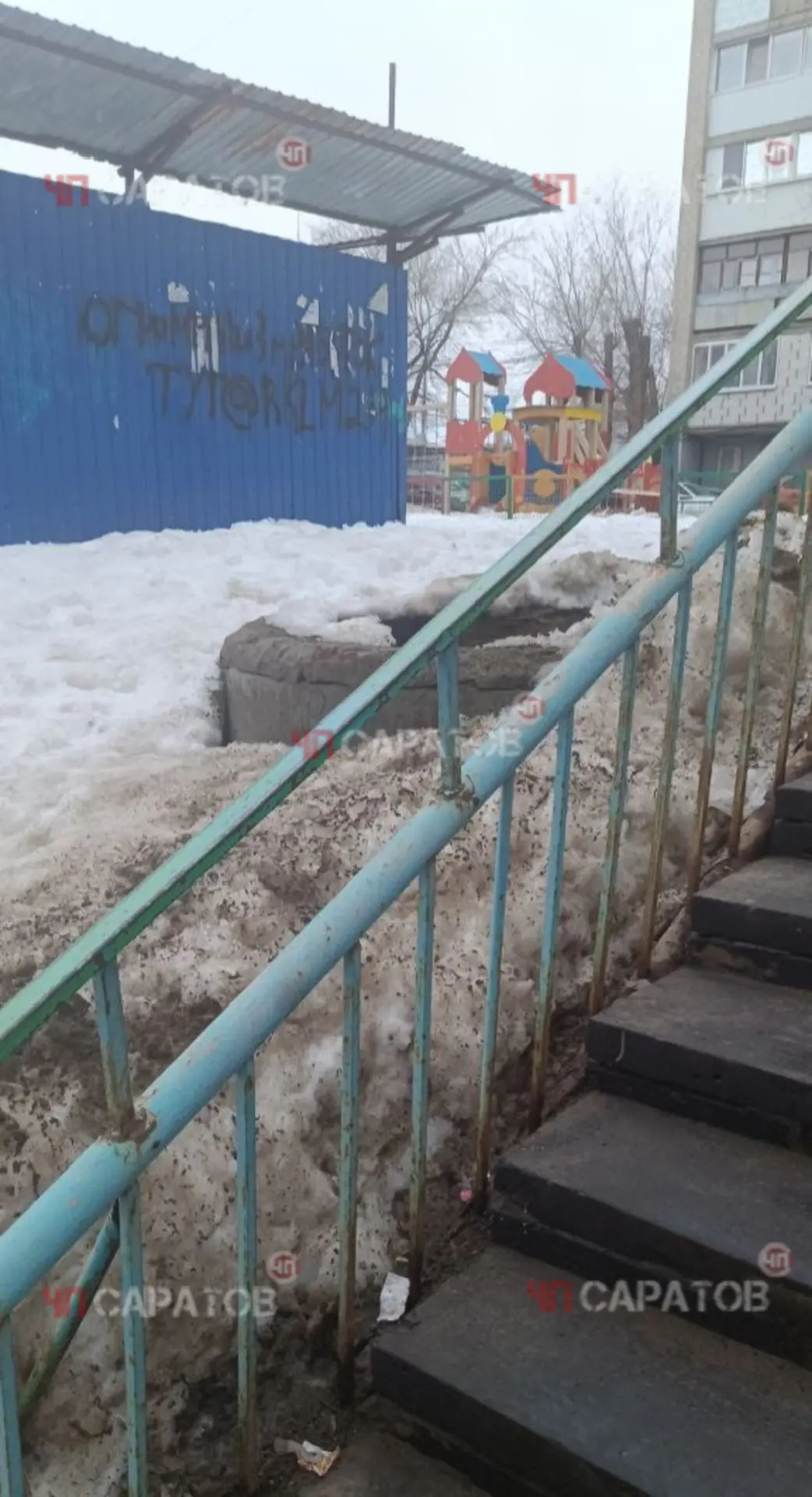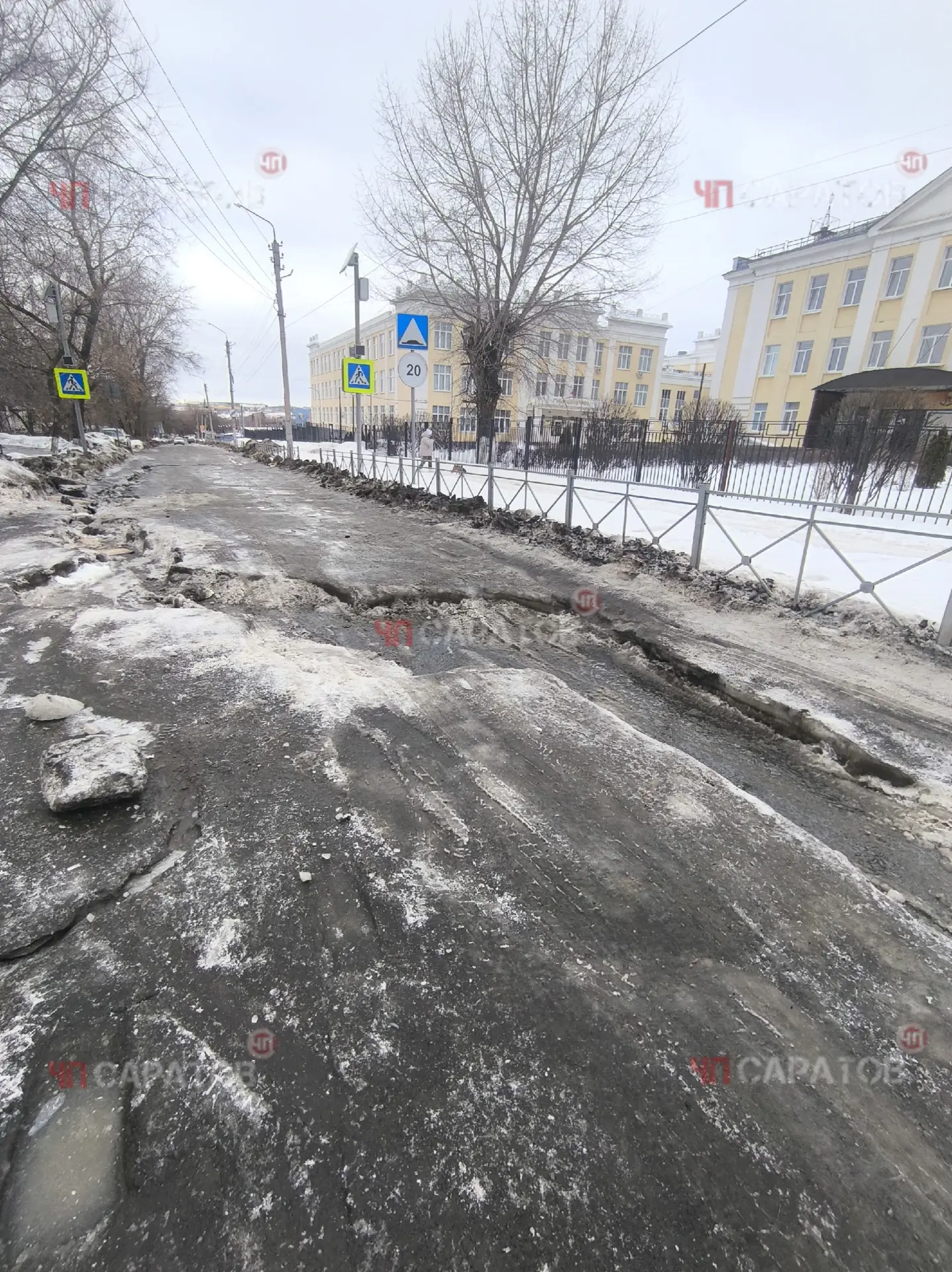 Малая Елшанская 7 , напротив гимназии 89 проезда нет по центральной дороги.Люди не могут проехать и подвезти своих детей в школу, глыбы из льда около 35см,промоины.