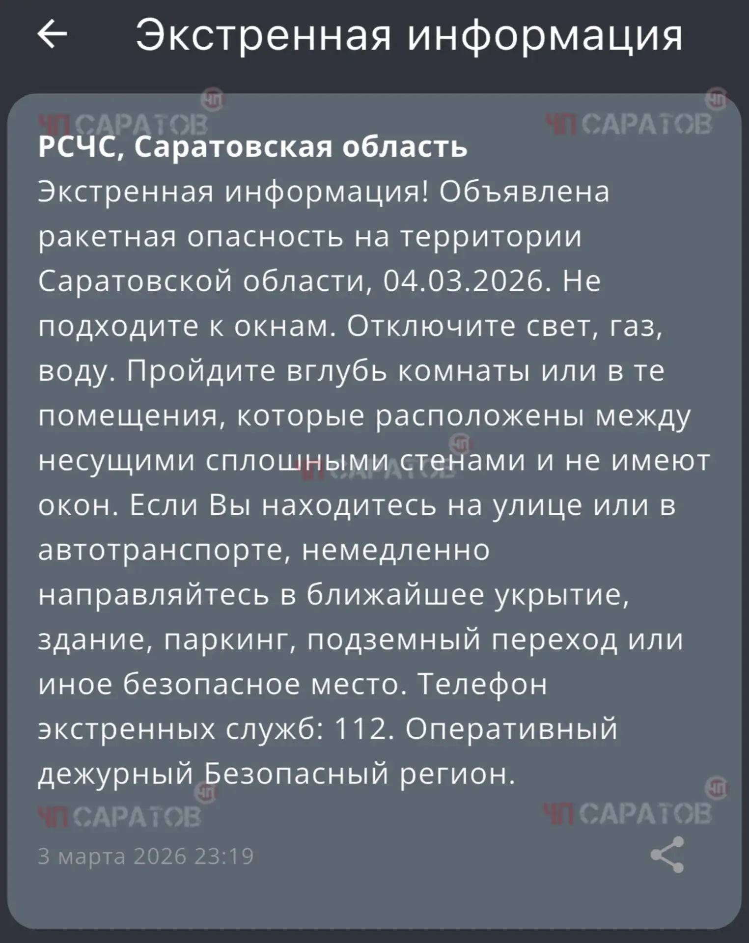 «Объявлена ракетная опасность на территории Саратовской области» - РСЧС.