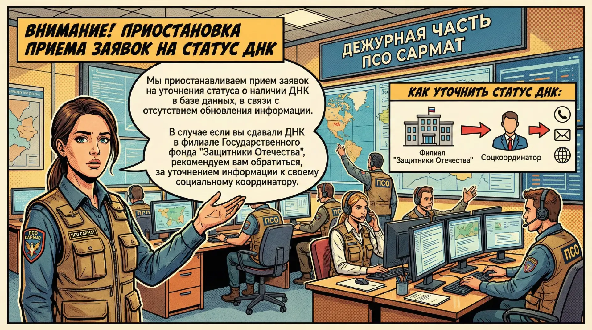 Сообщаем вам, что мы приостанавливаем прием заявок на уточнения статуса о наличии ДНК в базе данных через чат-бот в национальном мессенджере Max. Это решение связано с отсутствием обновления информации. Мы понимаем, что это может вызвать некоторые неудобства, и приносим извинения за доставленные неудобства.
