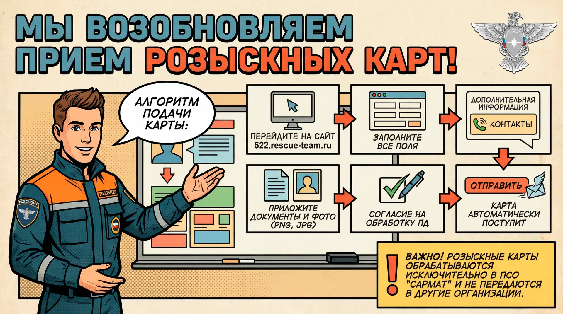 Важным сообщением спешим поделиться с вами. Прием розыскных карт через модуль 522.rescue-team.ru больше не осуществляется. Это связано с тем, что в 522-й Центр приема обработки и отправки погибших Министерства обороны Российской Федерации (ЦПООП) поступает большое количество розыскных карт из Государственного фонда "Защитники Отечества" и других источников, в связи с чем происходит большое дублирование работы.