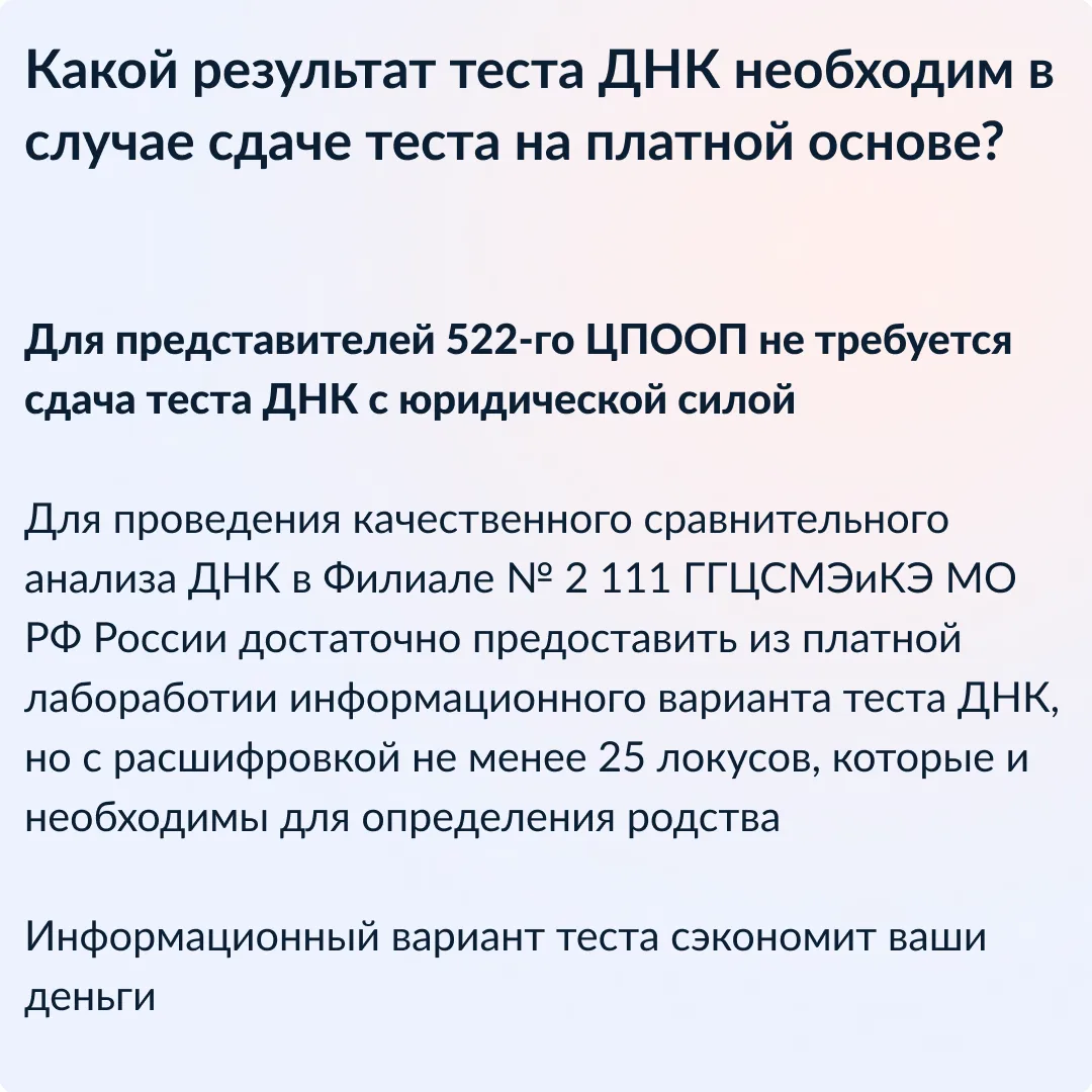 ❗Важно! Для процедуры опознания погибшего военнослужащего в 522-ом ЦПООП не требуется результата профилированного ДНК с юридической силой, достаточно информационного варианта.