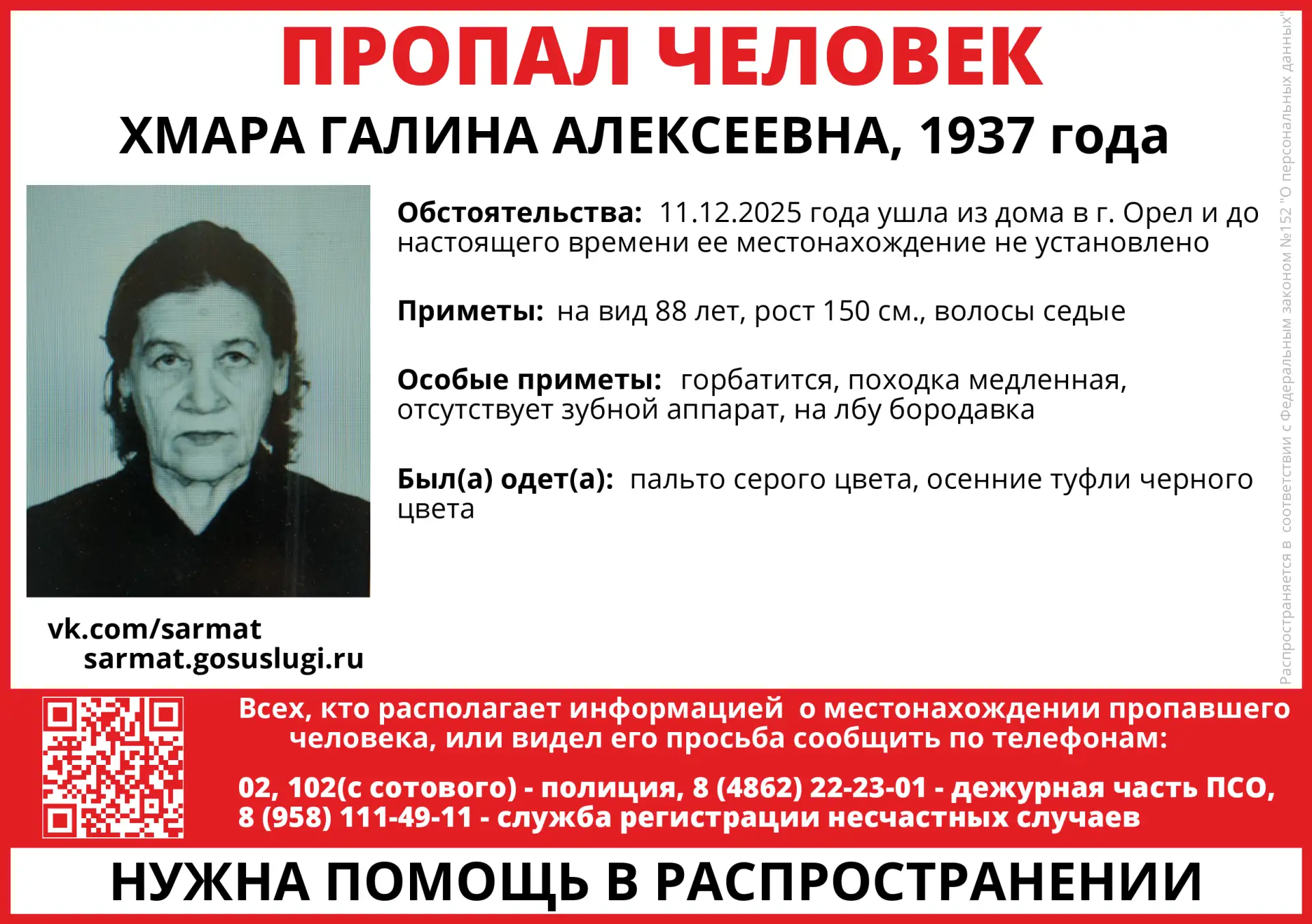 Службой регистрации несчастных случаев Орловской области устанавливается местонахождение Хмары Галины Алексеевны 1937 года рождения, которая 11.12.2025 года ушла из дома в г. Орел и до настоящего времени ее местонахождение не установлено