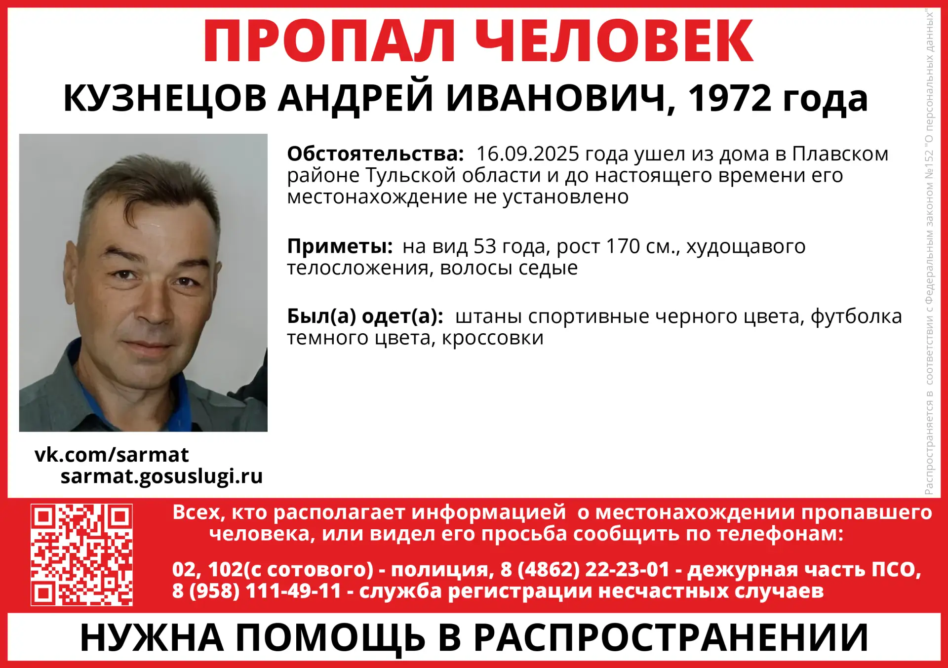 Службой регистрации несчастных случаев Орловской области устанавливается местонахождение пропавшего Кузнецова Андрея Ивановича, 1972 года рождения, который 16.09.2025 года ушел из дома в Плавском районе Тульской области и до настоящего времени его местонахождение не установлено