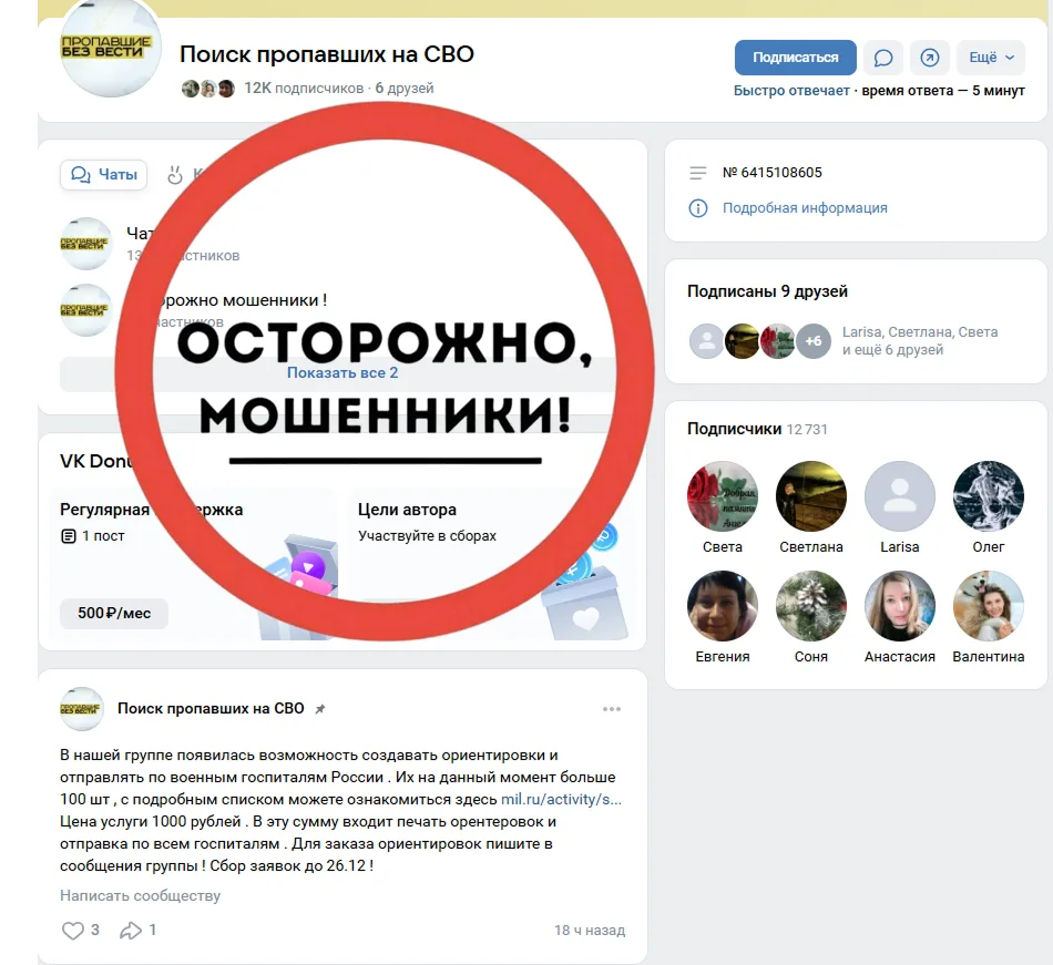В социальной сети ВКонтакте продолжает действовать мошенническая группа: https://vk.ru/club224388372. Они под видом услуг по поиску пропавших военнослужащих не только собирают личные данные, но и занимаются сбором денег с родственников бойцов.