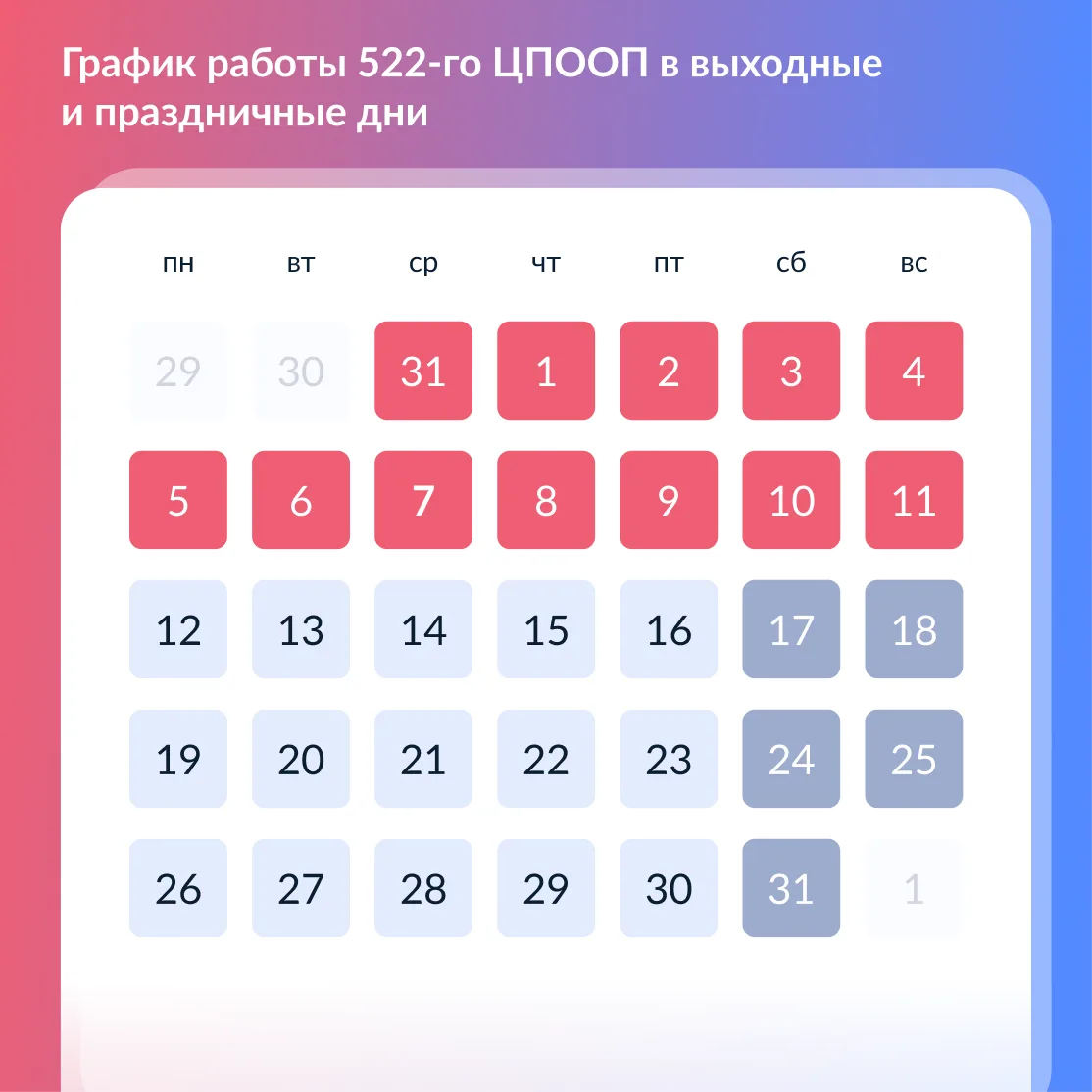 522-й Центр приема, опознания и отправки погибших Министерства обороны Российской Федерации в выходные и праздничные дни работает по следующему графику: