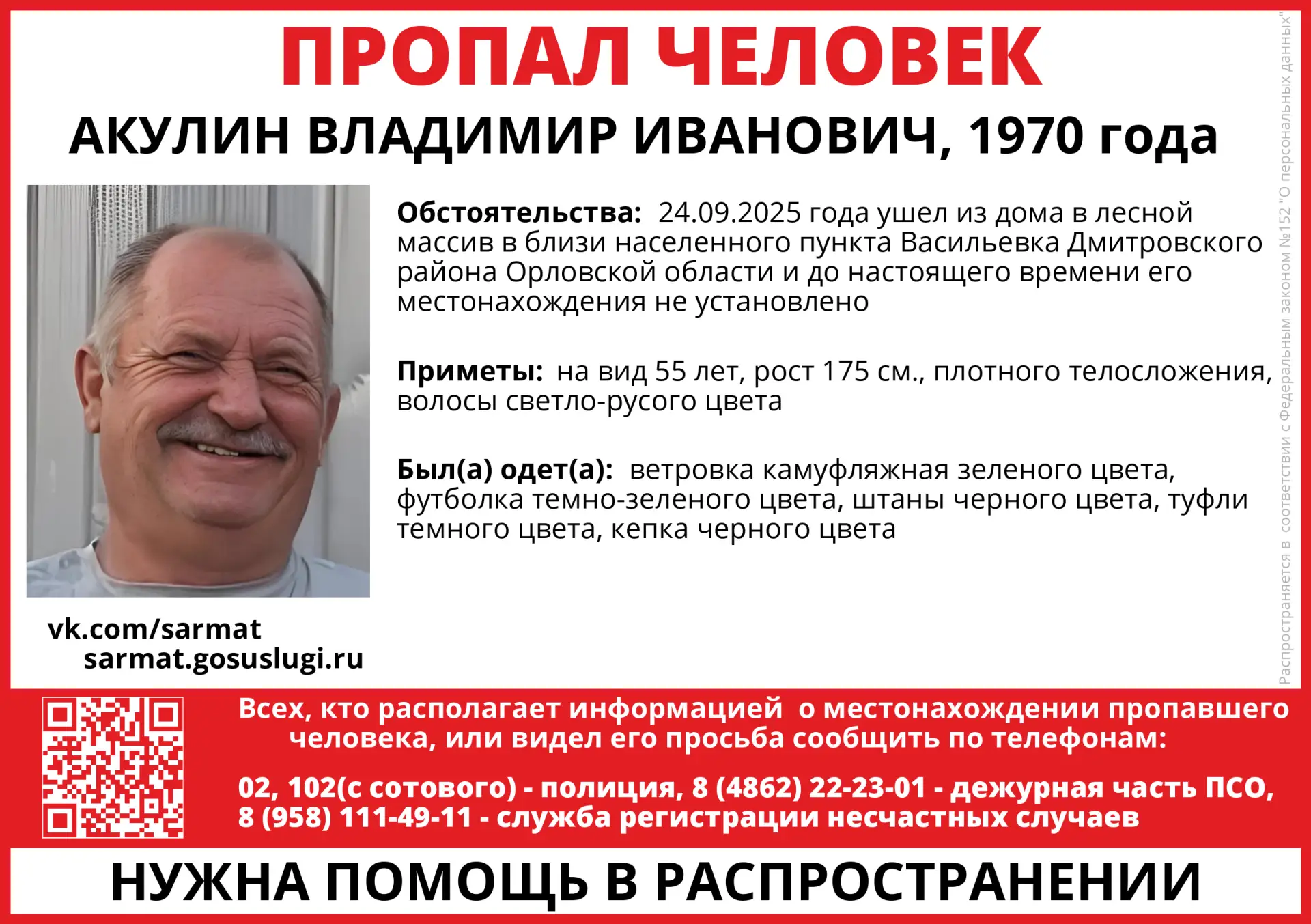 Службой регистрации несчастных случаев Орловской области устанавливается местонахождение пропавшего Акулина Владимира Ивановича, 1970 года рождения, который 24.09.2025 года ушел из дома в лесной массив в близи населенного пункта Васильевка Дмитровского района Орловской области и до настоящего времени его местонахождения не установлено