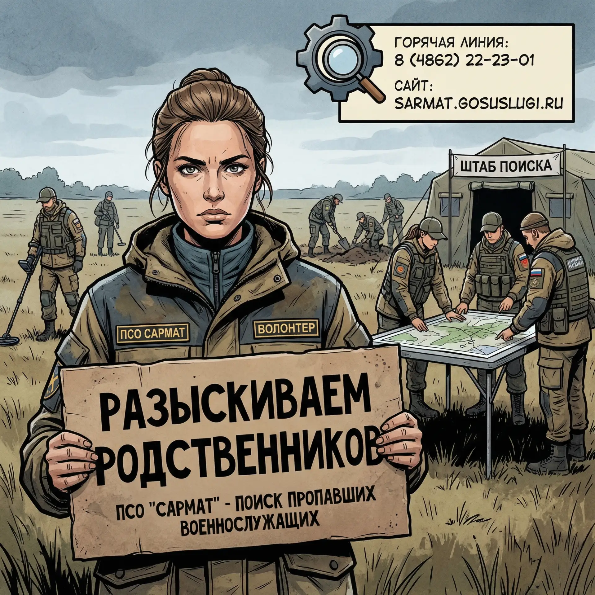 Орловская региональная общественная организация по поиску пропавших, защите и спасению людей в условиях чрезвычайных ситуаций "Поисково-спасательный отряд "Сармат" в рамках содействия и координации поиска пропавших без вести Защитников Отечества организовал работу по приему родственников без вести пропавших.