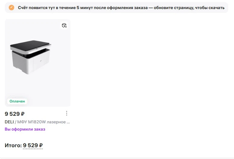 Принтер был успешно приобретен через платформу маркетплейса WB, принтер уже готовится к отправке. Он станет полезным инструментом для выполнения служебных задач и упрощения документооборота.