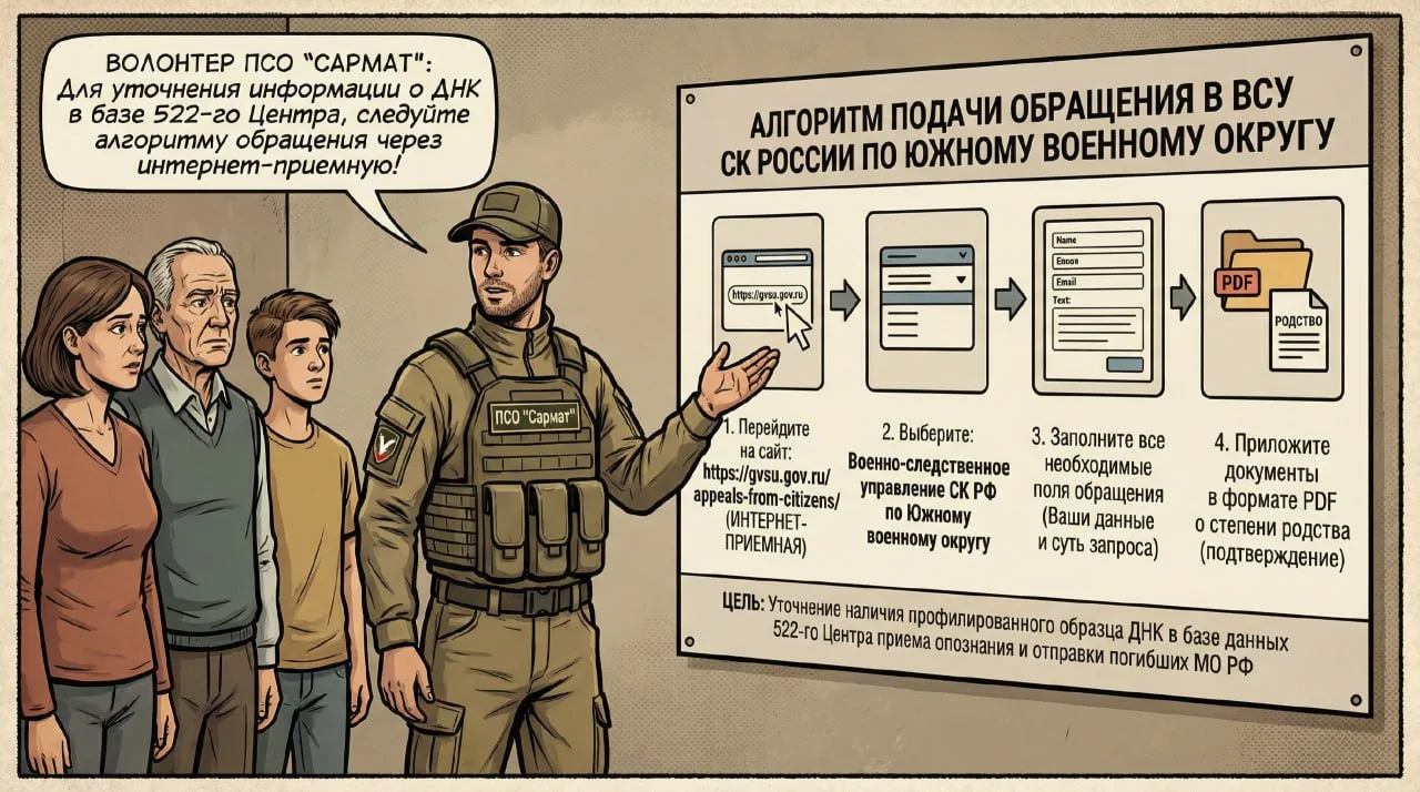 Рассказываем алгоритм подачи обращения в Военно-следственное управление Следственного комитета Российской Федерации по Южному военному округу с целью получения информации о наличии ДНК в базе данных 522-го ЦПООП.
