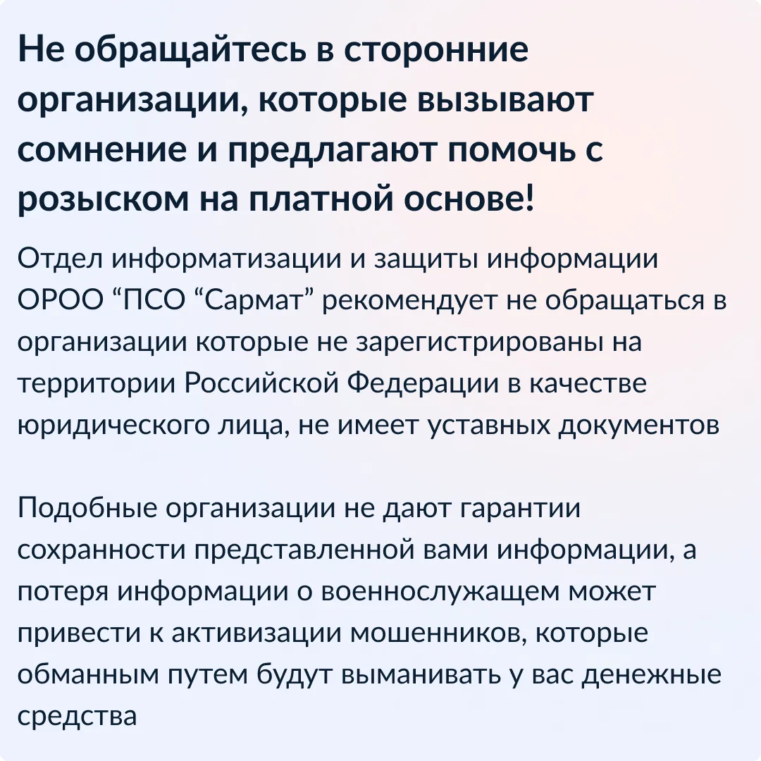 Обратиться в отдел по поиску пропавших людей родственникам пропавшего военнослужащего можно только написав нам в группу в социальной сети ВКонтакте https://vk.com/sarmat