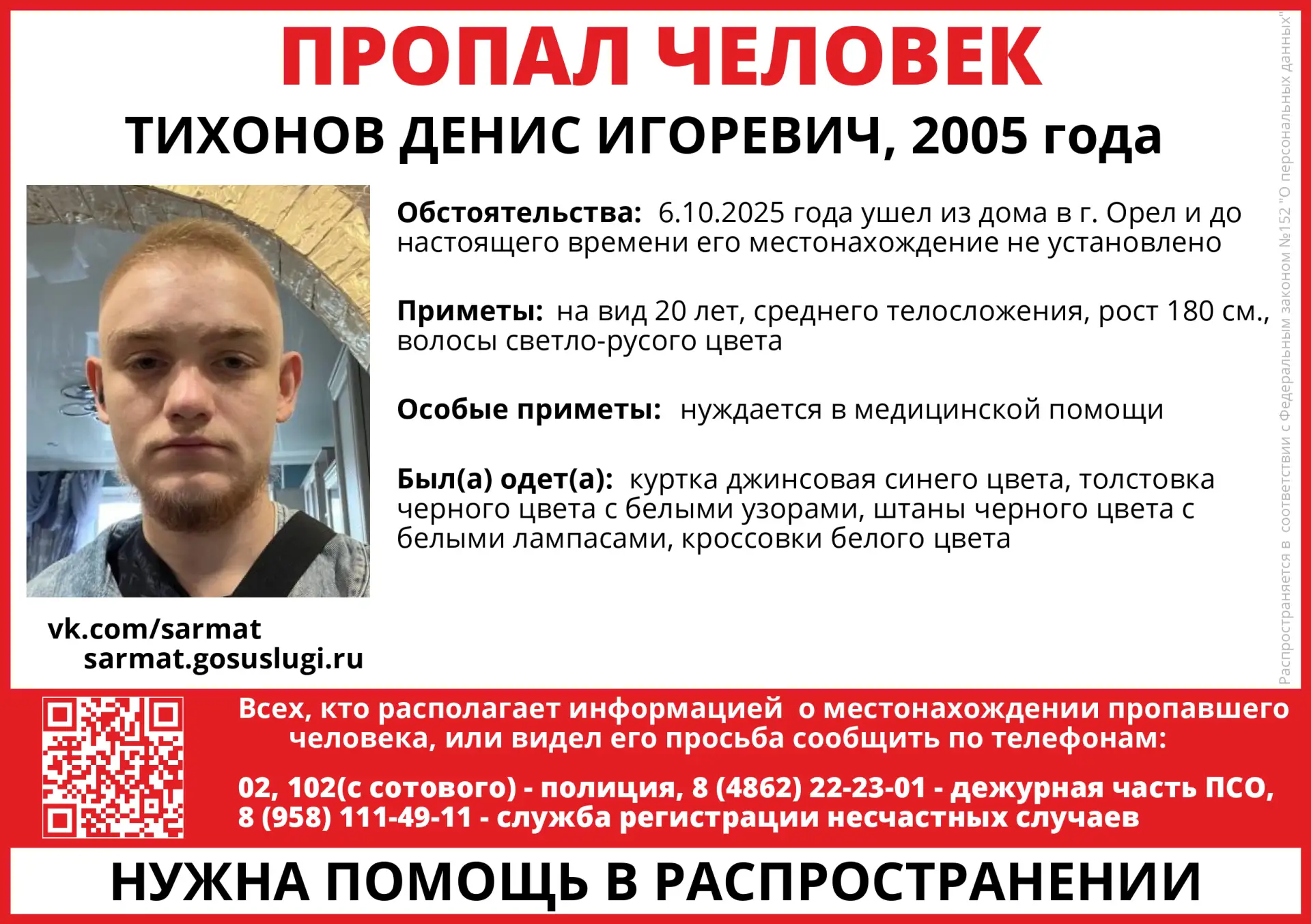 ОП №3 (по Северному району) УМВД России по г. Орлу устанавливается местонахождение Тихонова Дениса Игоревича 05.03.2005 года рождения, который 6.10.2025 года ушел из дома в г. Орел и до настоящего времени его местонахождение не установлено. Нуждается в медицинской помощи.