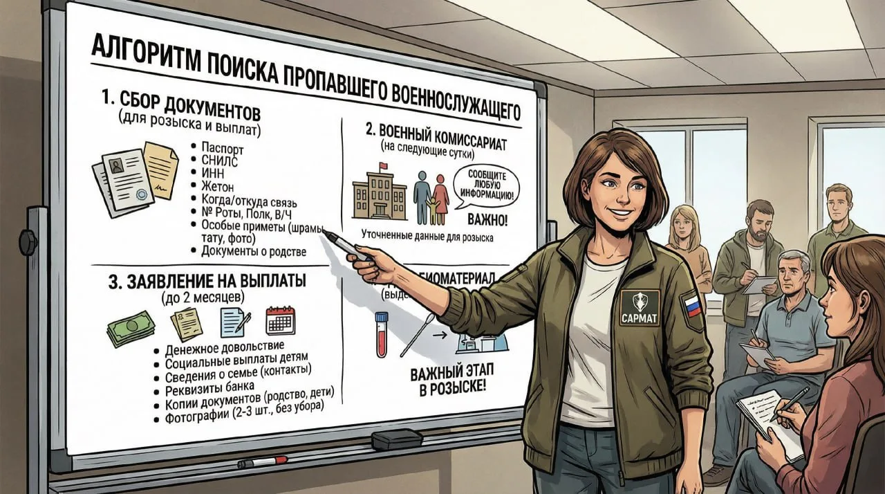 Для организации розыскных мероприятий и получения социальных выплат по пропавшему военнослужащему рекомендуем ознакомиться с подготовленной памяткой: https://vk.com/@sarmat-shagi-po-poisku-propavshego-voennosluzhaschego