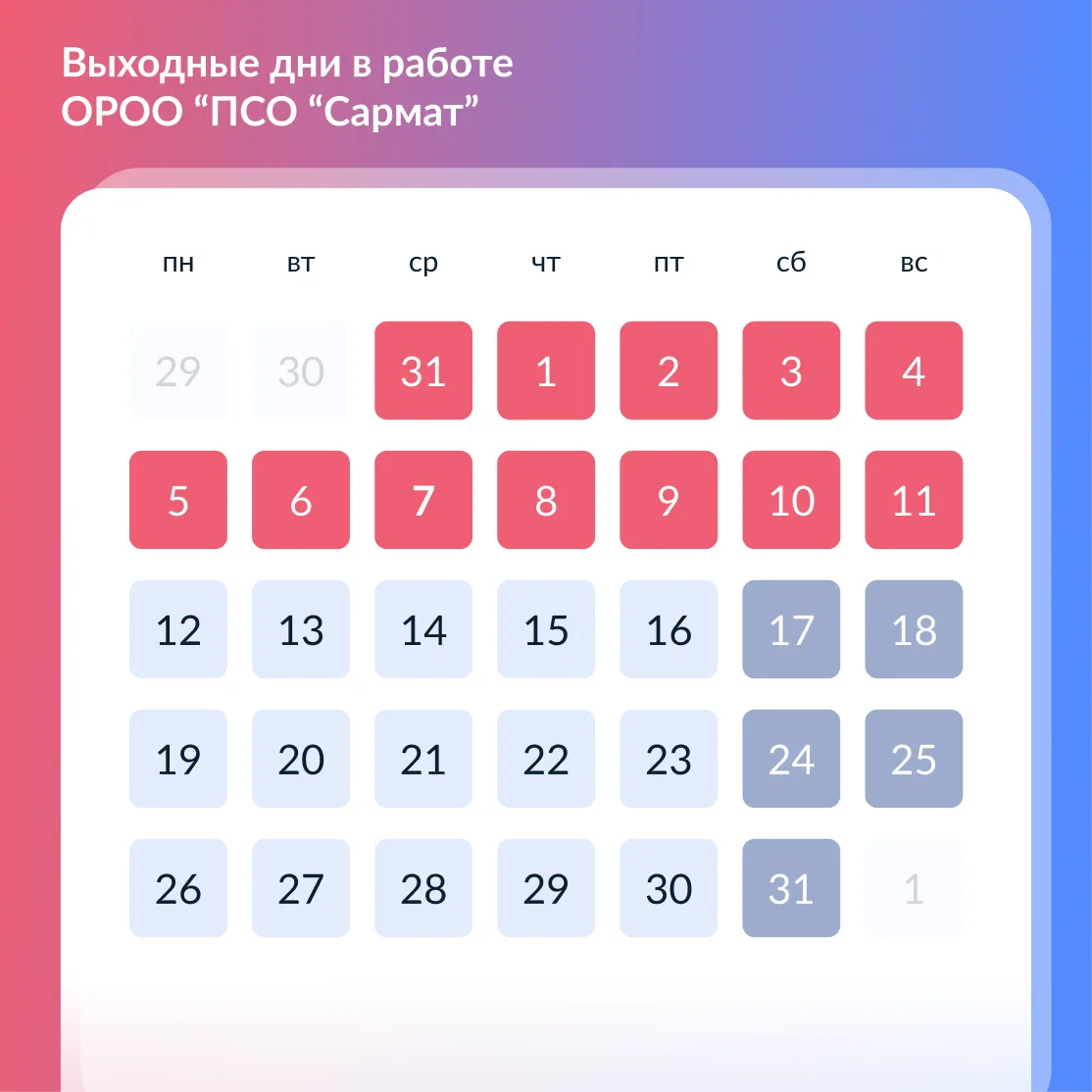 Орловская региональная общественная организация по поиску пропавших, защите и спасению людей в условиях чрезвычайных ситуаций "Поисково-спасательный отряд "Сармат" сообщает о праздничном графике работы!