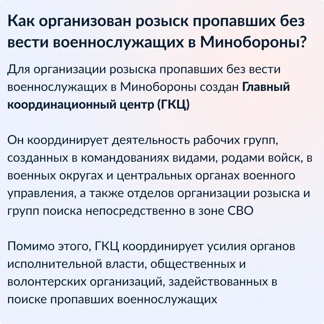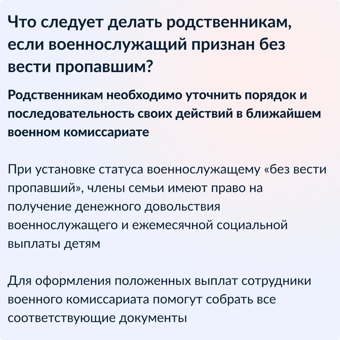 Обращаем ваше внимание, что работа бота сосредоточена на вопросах финансового обеспечения членов семей военнослужащих, пропавших без вести.