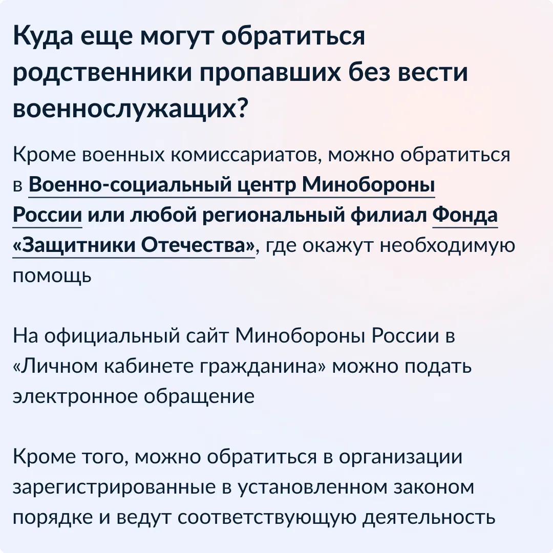 📌Если у вас имеется информация или вы считаете, что ваш родственник может находиться в плену, рекомендуем вам направить запрос в Главное управление военной полиции Министерства обороны - https://sarmat.gosuslugi.ru/poleznaya-informatsiya/poleznaya-informatsiya_32.html