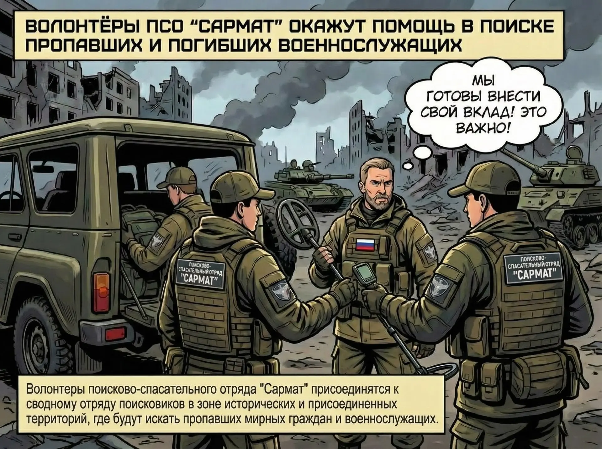 Волонтеры поисково-спасательного отряда "Сармат" присоединятся к сводному поисковому отряду, который займется поиском пропавших мирных граждан и военнослужащих на исторических и присоединенных территориях.