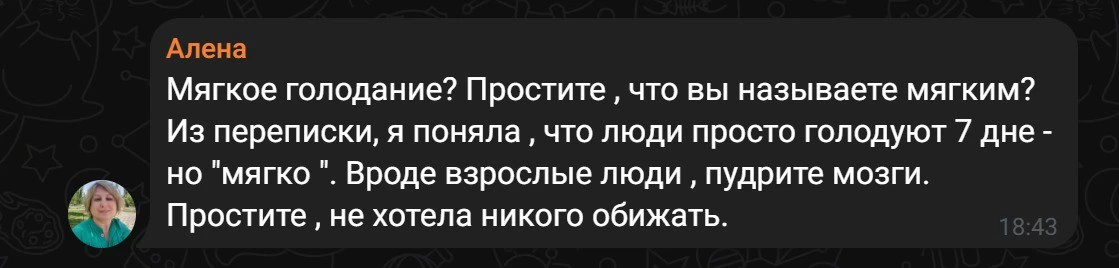 «Хвалю себя за то, что легко прошла пятый день выхода из голодания и благополучно прошла курс до конца.»