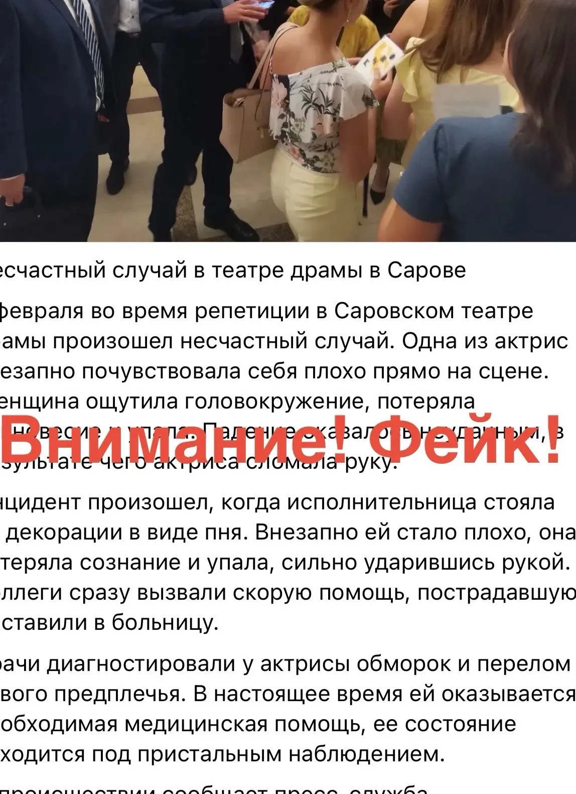 Дорогие зрители! Слухами и домыслами продолжает наполняться интернет о ситуации с артисткой театра, произошедшей на спектакле «Золотой петушок» 7 февраля. Никаких переломов нет и не было! Артистка была осмотрена специалистами Клиническая больница №50 Саров и отпущена домой. С артисткой всё хорошо. Берегите себя и своих близких. Доверяйте только официальной информации.