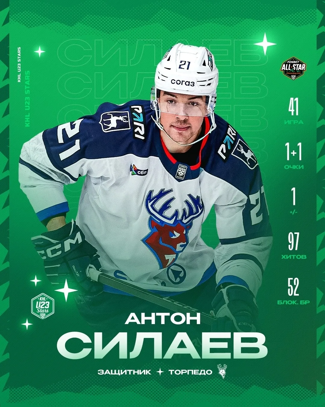 Защитник «Торпедо» Антон Силаев сыграет за команду молодых талантов KHL U23 Stars.