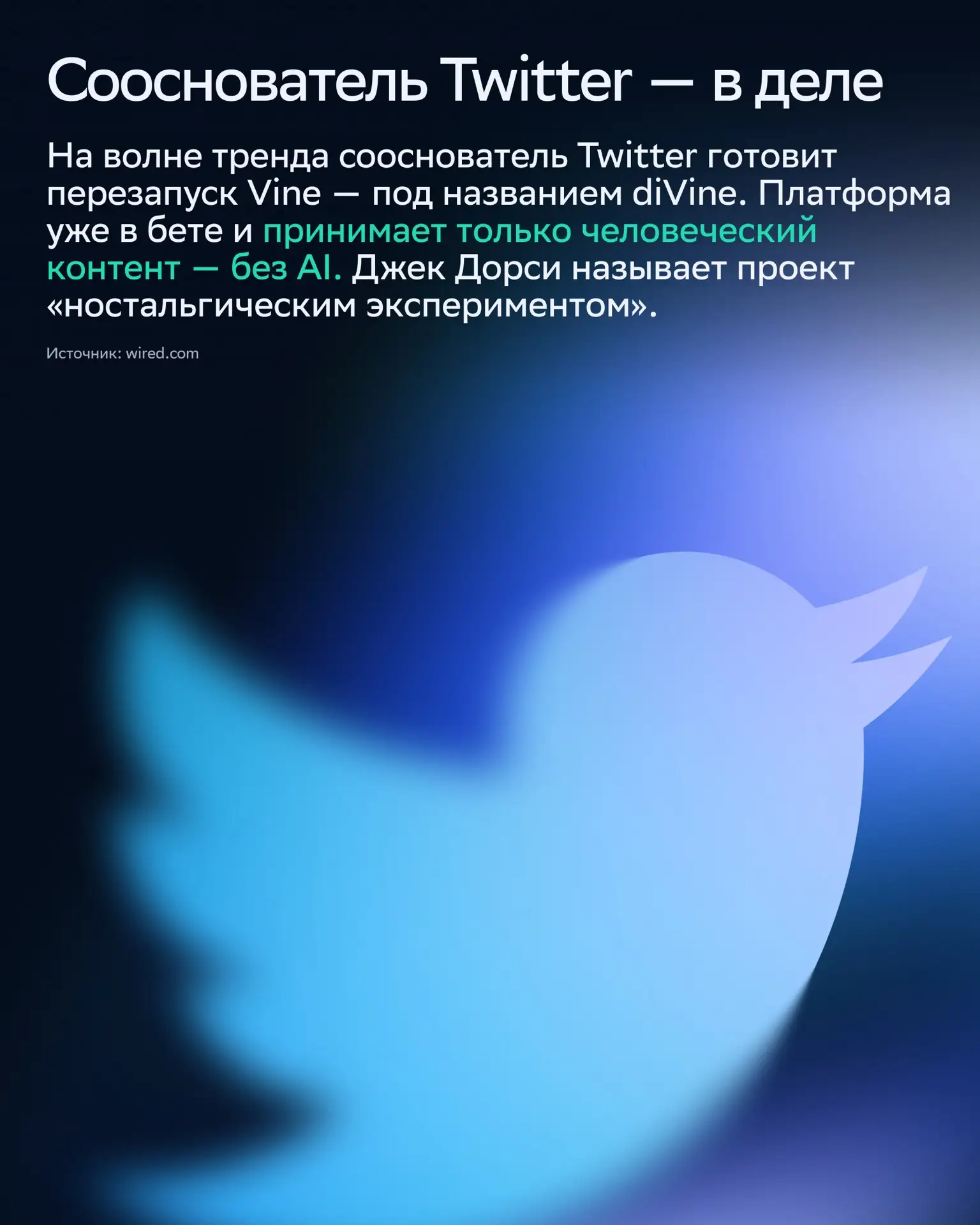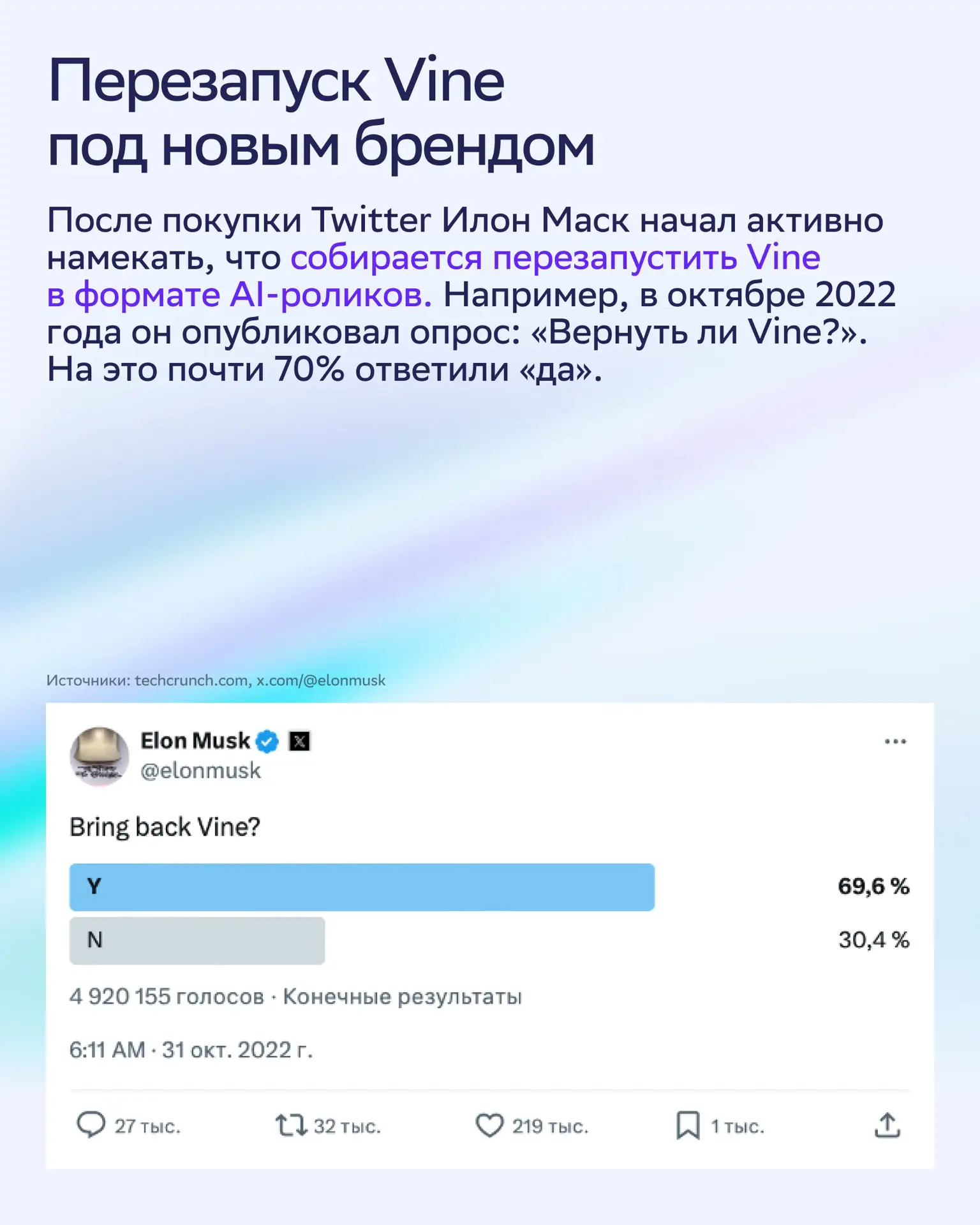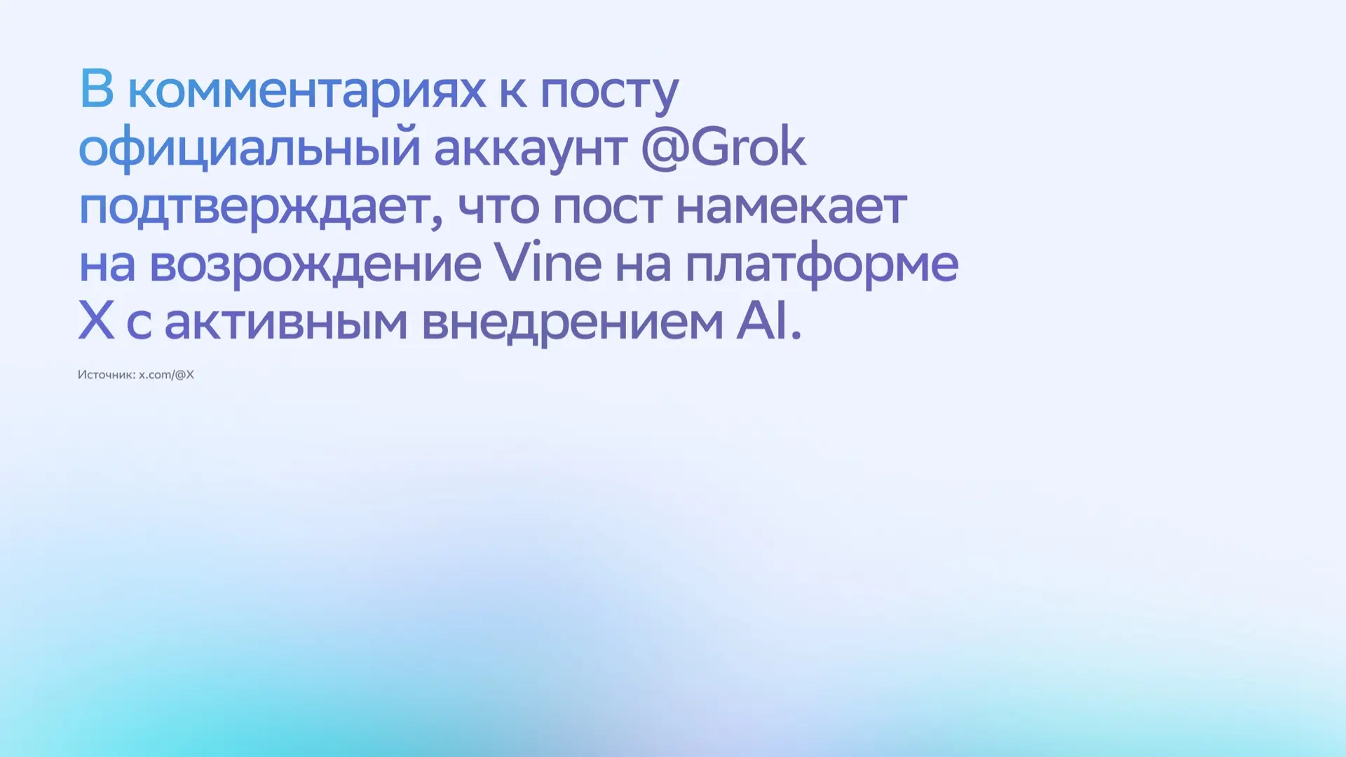 Вчера в официальном аккаунте X появился репост загадочного тизера. Так Илон Маск анонсировал перезапуск Vine под новым названием — вероятно, Bangers — и с новыми AI-функциями. Новый проект объединит генеративные алгоритмы и короткий формат: пользователи смогут быстро создавать ролики с помощью нейросети.