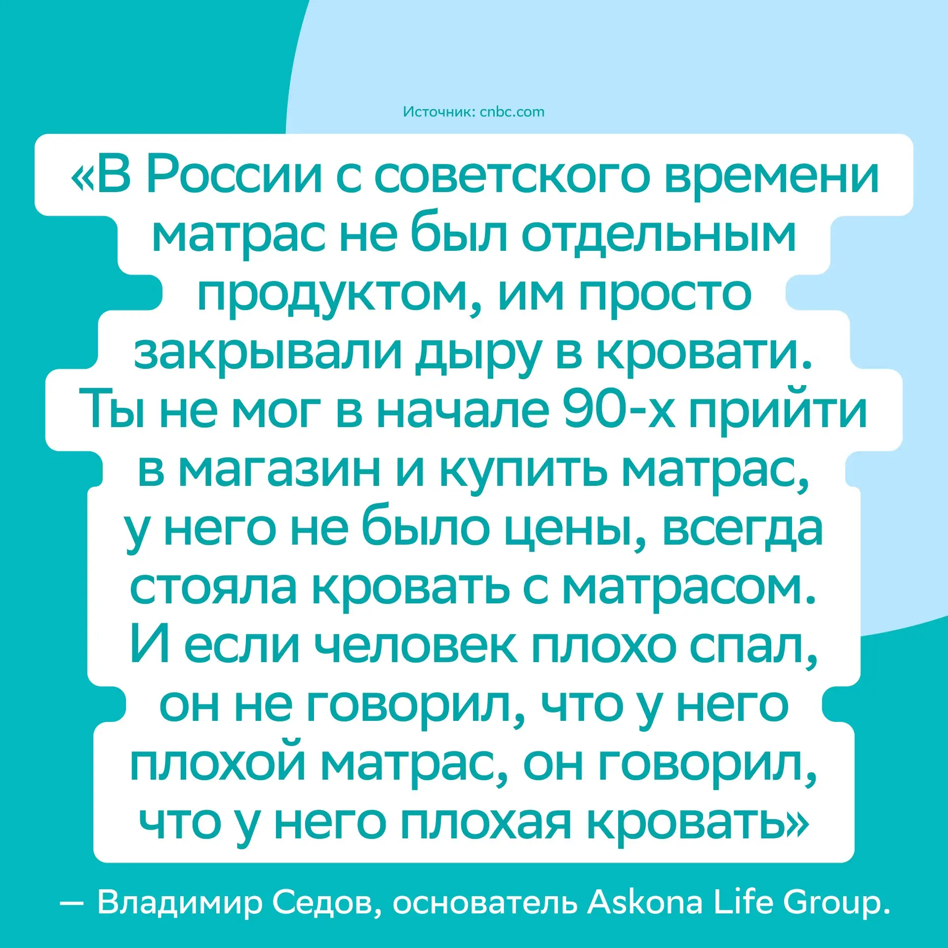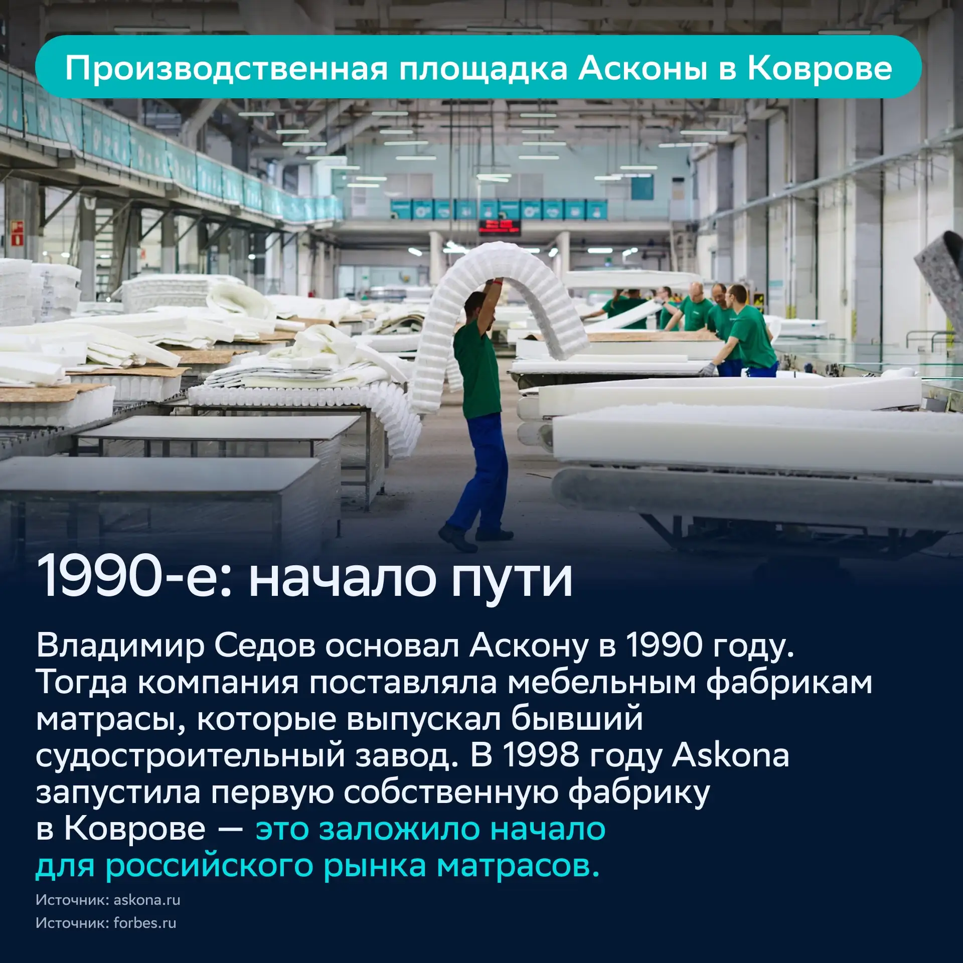 В «девяностых» в России не существовало рынка матрасов. Askona стала первой компанией, которая изменила этот подход. За 35 лет она прошла путь от небольшой фабрики в Коврове до крупнейшего производителя матрасов и товаров для сна в России.