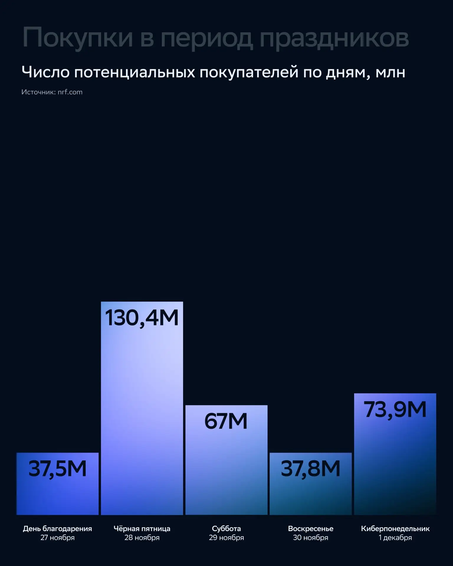 В этом году «Чёрная пятница» не только побила рекорды продаж в США, но и показала, что покупатели охотно используют AI для онлайн-шопинга. Переходы на сайты ритейлеров из чат-ботов выросли на 805% год к году, а конверсия таких пользователей оказалась на 38% выше, чем у остальных.