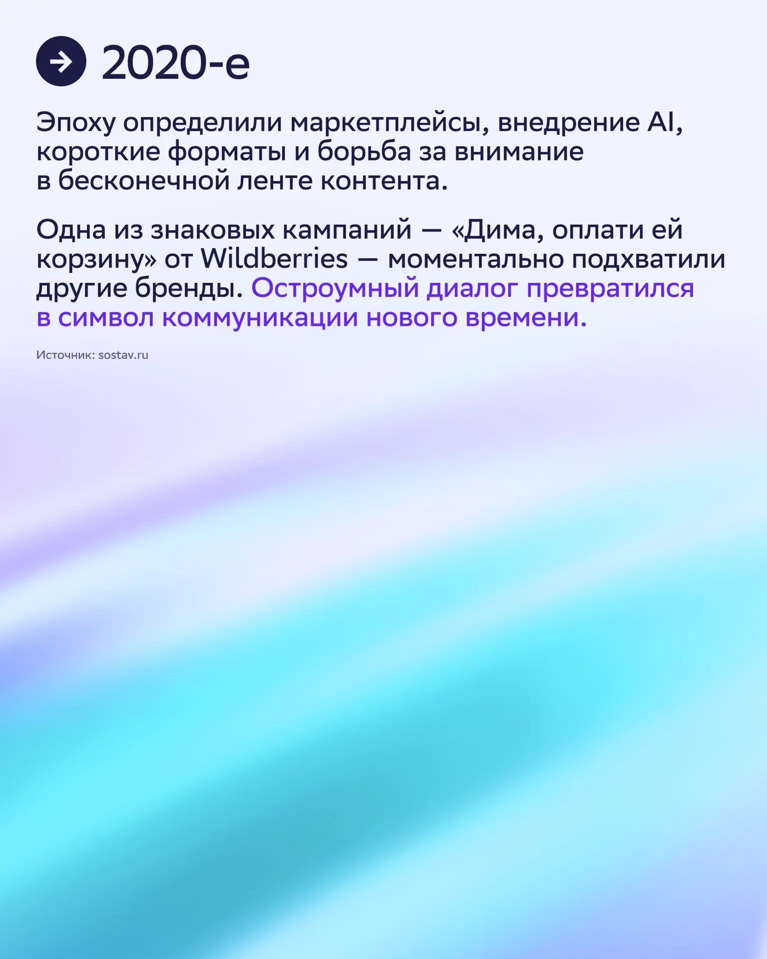 Если визуальные символы — это язык культуры, то реклама — её дневник. В ней отражаются привычки, ценности и настроение времени. По смене оптики можно считать и развитие российского общества: что вдохновляло, чего опасались и о чём мечтали в каждый период.