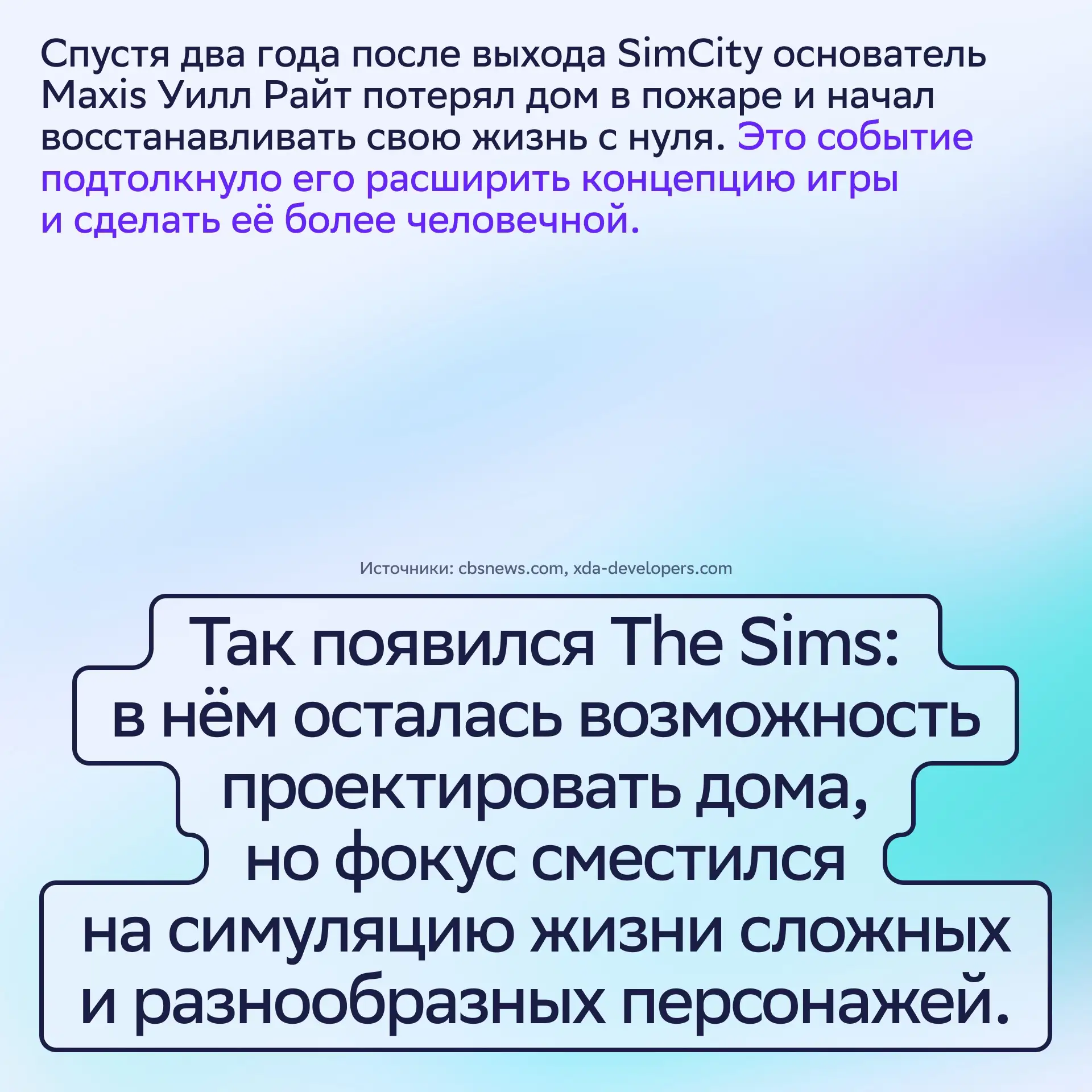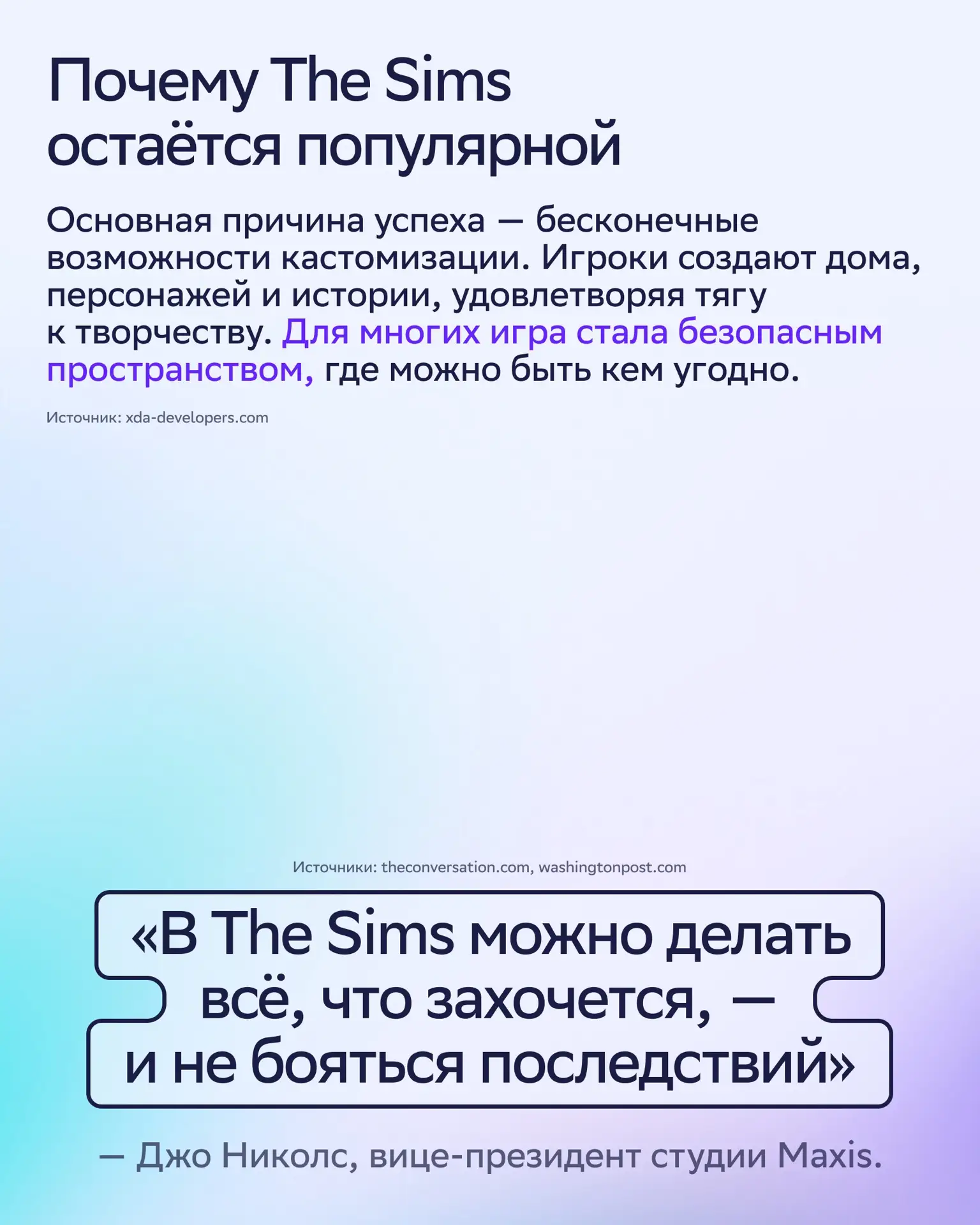 Почему спустя четверть века The Sims остаётся площадкой для самовыражения миллионов игроков, читайте в карточках.
