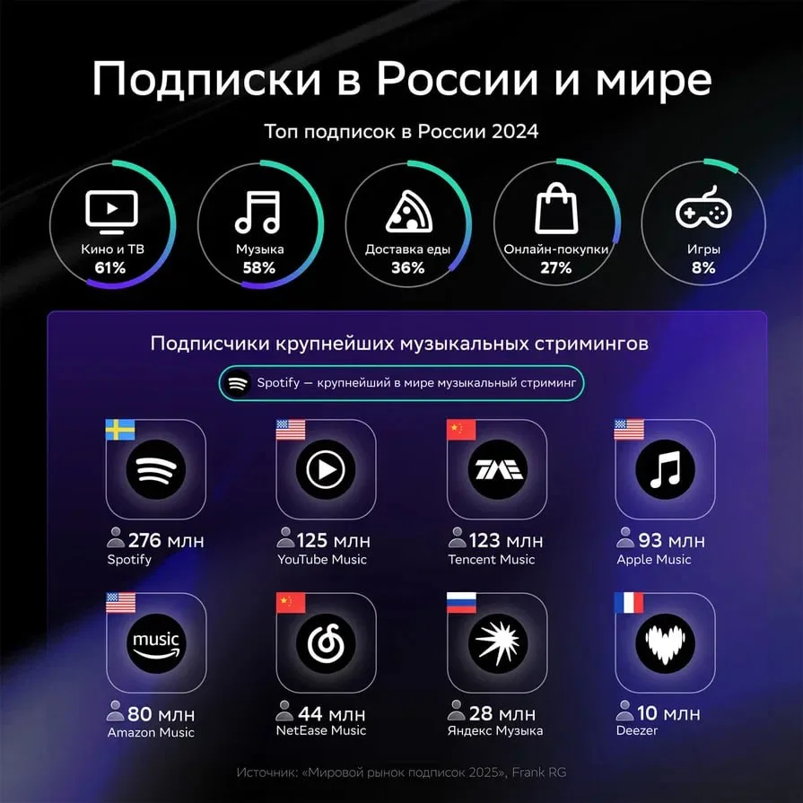 Доля пользователей сервисов подписок в разных странах варьируется от 2% до 49%. Россия с 49 млн подписчиков (34% населения) входит в группу стран с высокой долей пользователей. Для сравнения: в США — 43%, в Великобритании — 30%.