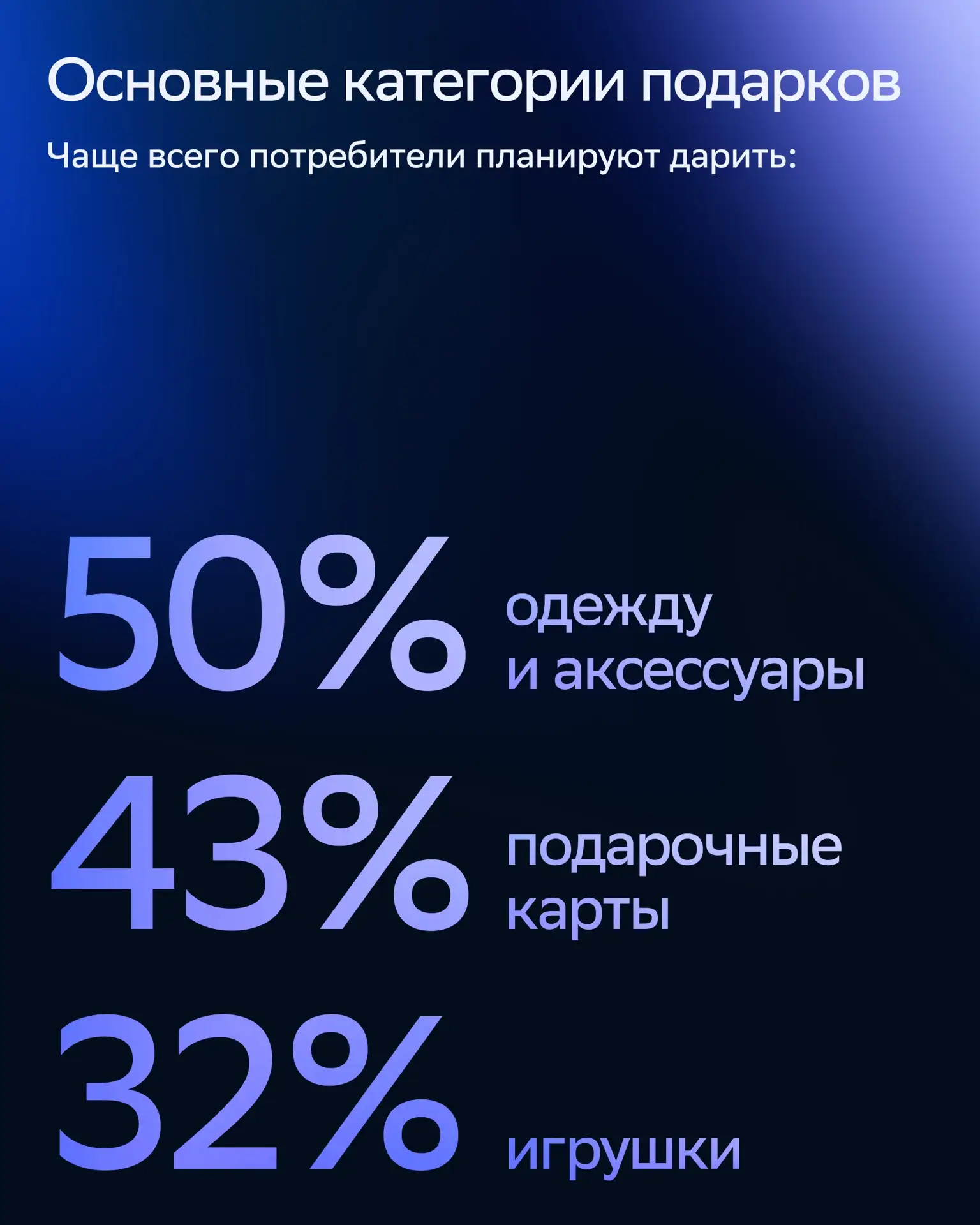 С прошлого года покупательские бюджеты выросли. Более половины участников собираются потратить до 15 тыс. рублей, ещё 11% — от 15 до 50 тыс., а 3% готовы вложить свыше 150 тыс. рублей. 67% россиян планируют делать покупки на маркетплейсах: треть из них комбинирует онлайн и офлайн, чтобы посмотреть товар вживую и заказать его выгоднее.