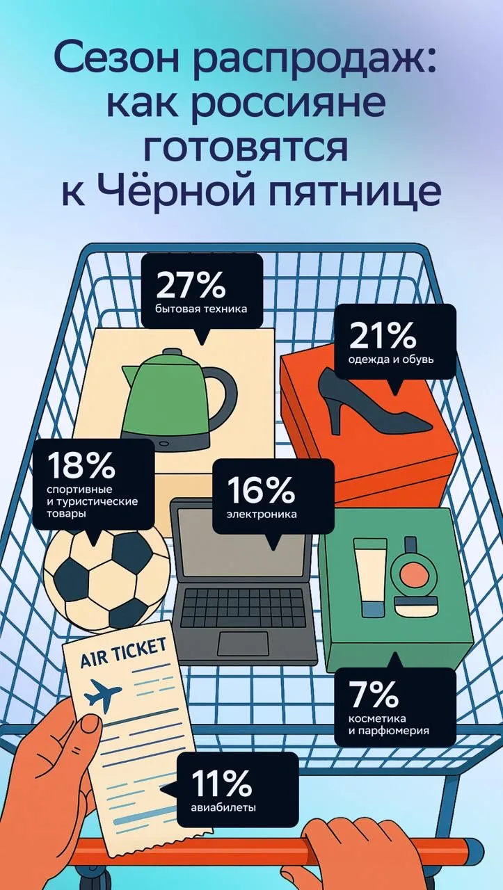 Исследование «Выберу.ру» показывает, что интерес к Чёрной пятнице остаётся стабильно высоким: 69% россиян планируют участвовать в распродаже, а каждый третий готовится к ней заранее и планирует бюджет. Покупатели становятся более осознанными: 27% уже составили список покупок, 11% добавили товары в корзины и зафиксировали цены до старта акций.