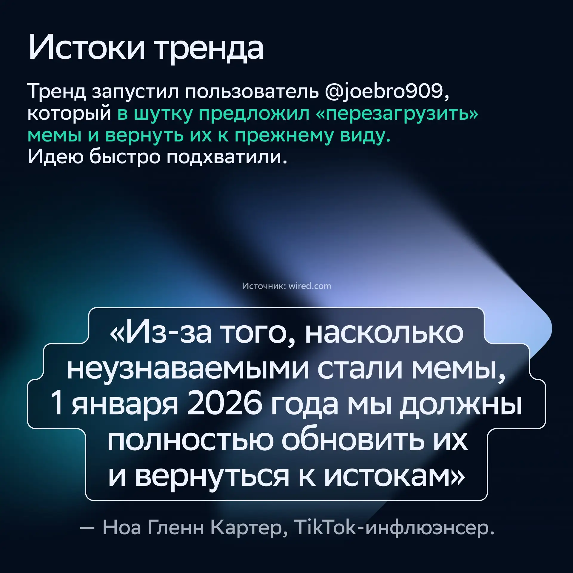 Интернет захлестнула волна AI-контента — одинакового, безжизненного, как будто собранного из одних и тех же шаблонов промптов. Пользователи TikTok хотят вернуть интернет прошлого, когда мемы были действительно смешными и осмысленными. Если верить этому тренду, в 2026 году мемы пройдут перезагрузку: пользователи «сотрут из памяти» последнее десятилетие интернет-культуры и вернутся к нарративам 2010-х.