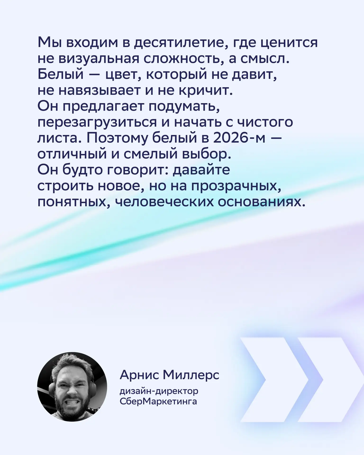 Вместе с Арнисом Миллерсом, дизайн-директором СберМаркетинга, рассказываем, почему именно белый стал цветом года и какую роль он играет в дизайне и бренд-айдентике.