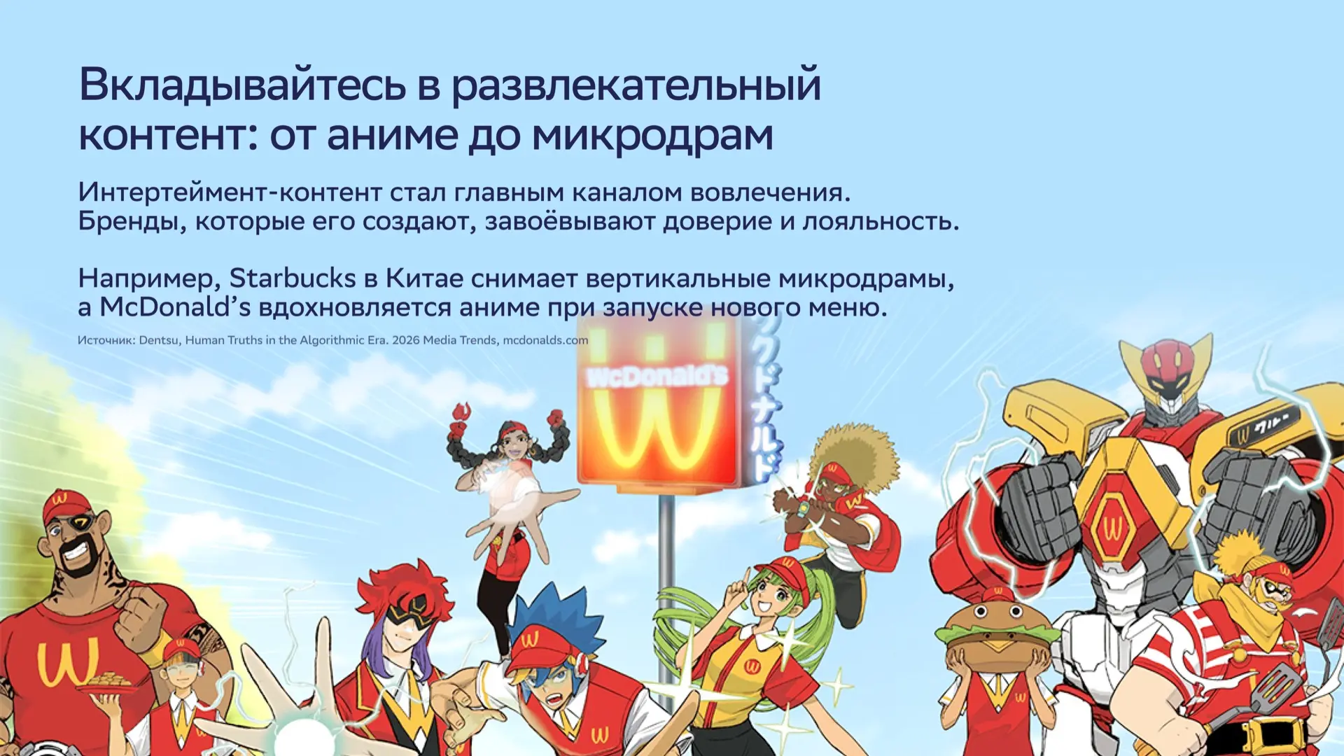 В 2026 году медиасреда будет меняться под давлением AI, торговых конфликтов и новых форматов платформ. Японский холдинг Dentsu выделил три неизменных принципа поведения людей: «мы просты — пока не становимся сложными», «мы — социальные существа» и «мы не читаем рекламу». На их основе аналитики определили девять медиатрендов на следующий год — разбираем их в карточках.