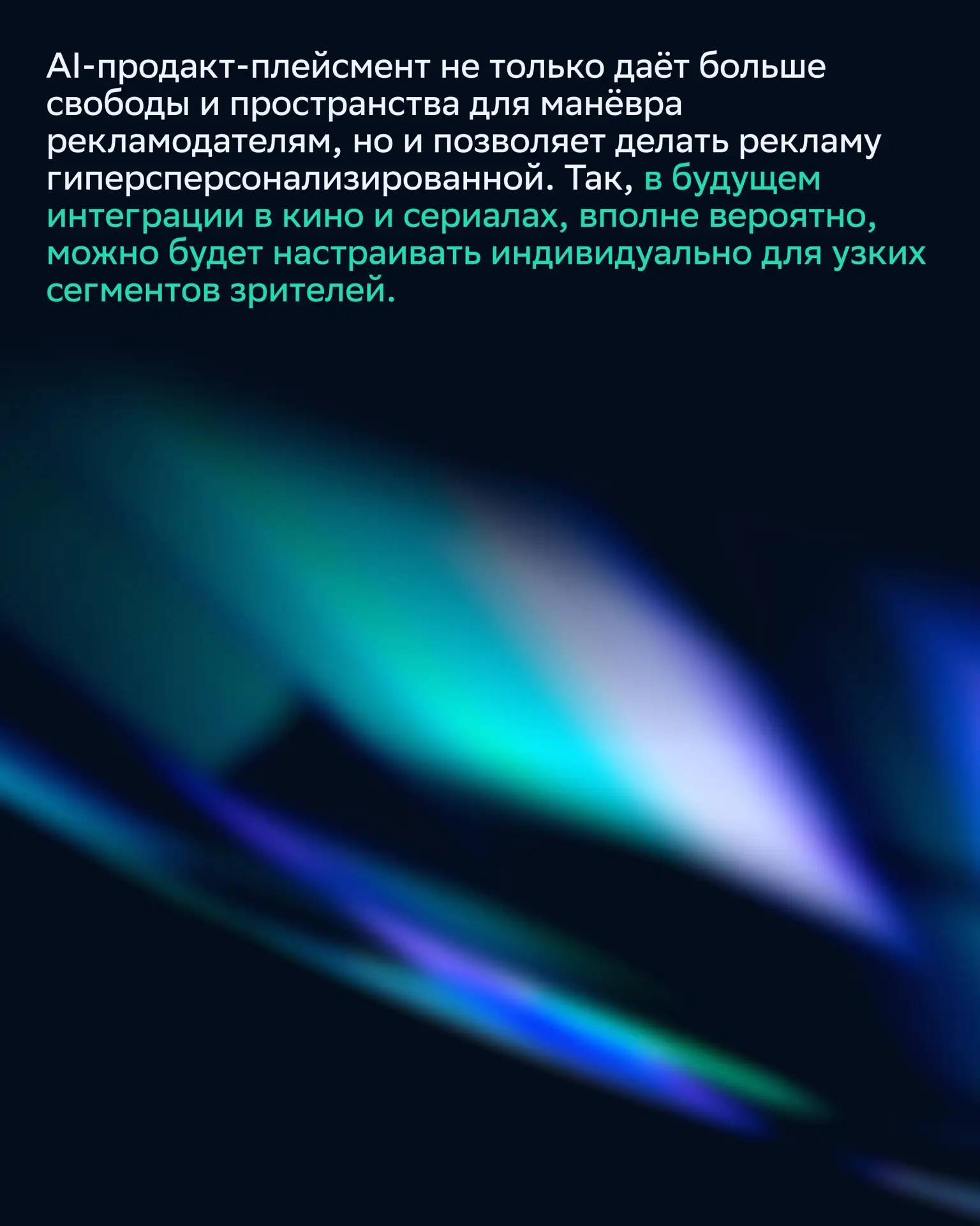 Однако благодаря AI это может измениться. На смену классической рекламе приходит виртуальный продакт-плейсмент, который позволяет не только добавлять интеграции в готовый контент, но и адаптировать её под каждого зрителя.