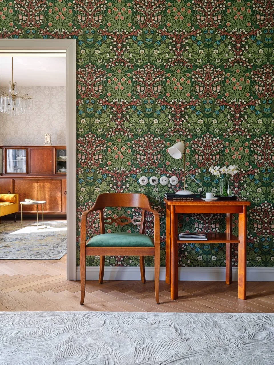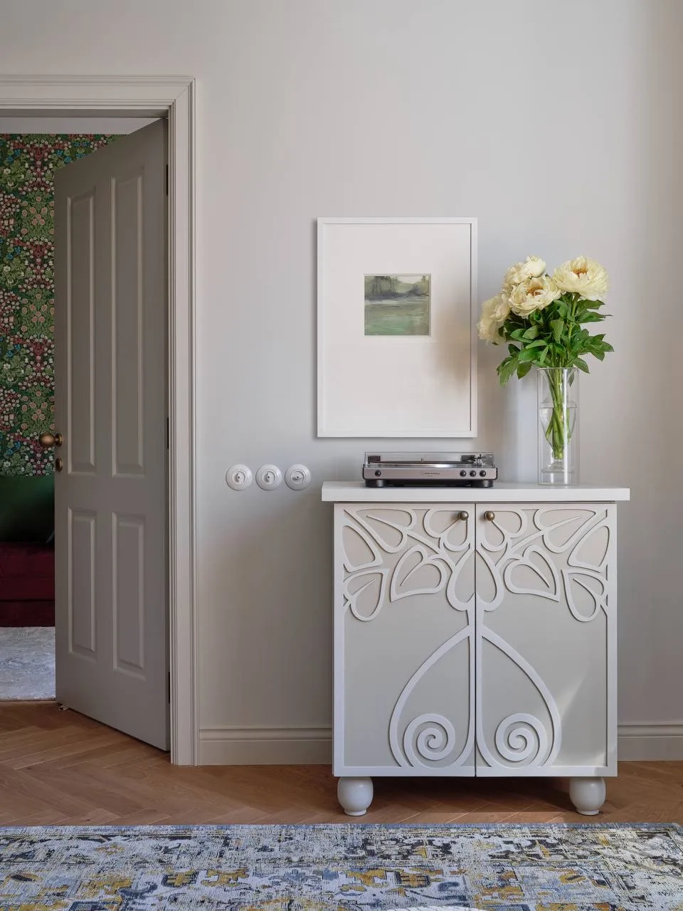В интерьере много винтажной мебели, которую хозяйка унаследовала от своих бабушек и дедушек. Например, кухонные стулья и семейный буфет в гостиной. Привлекают внимание и элементы английского стиля, такие как яркие обои с рисунками Уильяма Морриса. Несмотря на свою насыщенность, они прекрасно сочетаются со старинной мебелью.