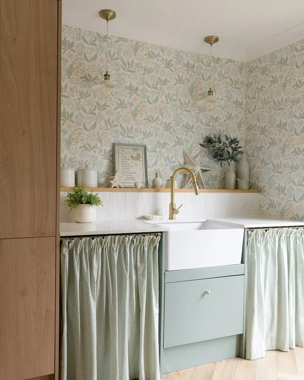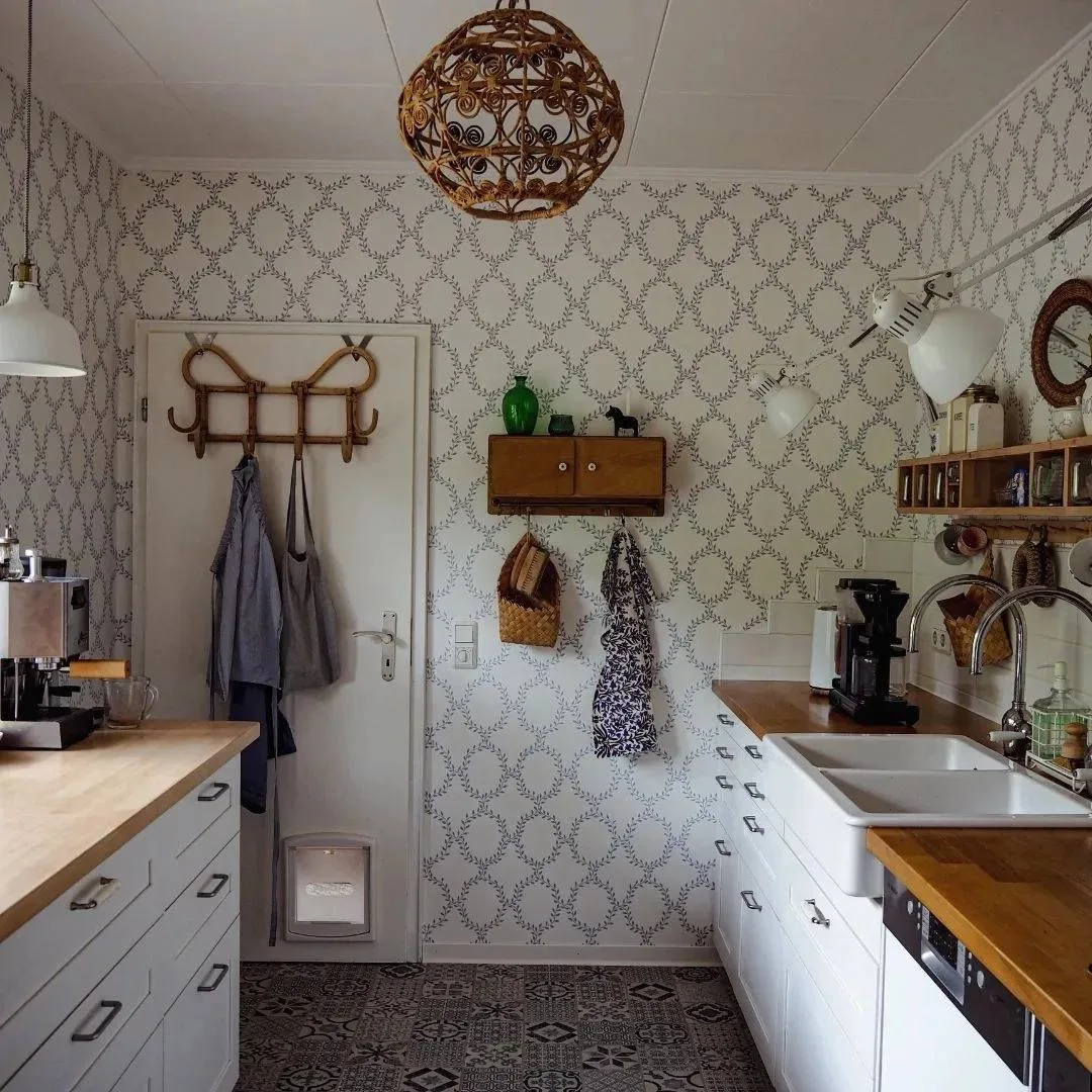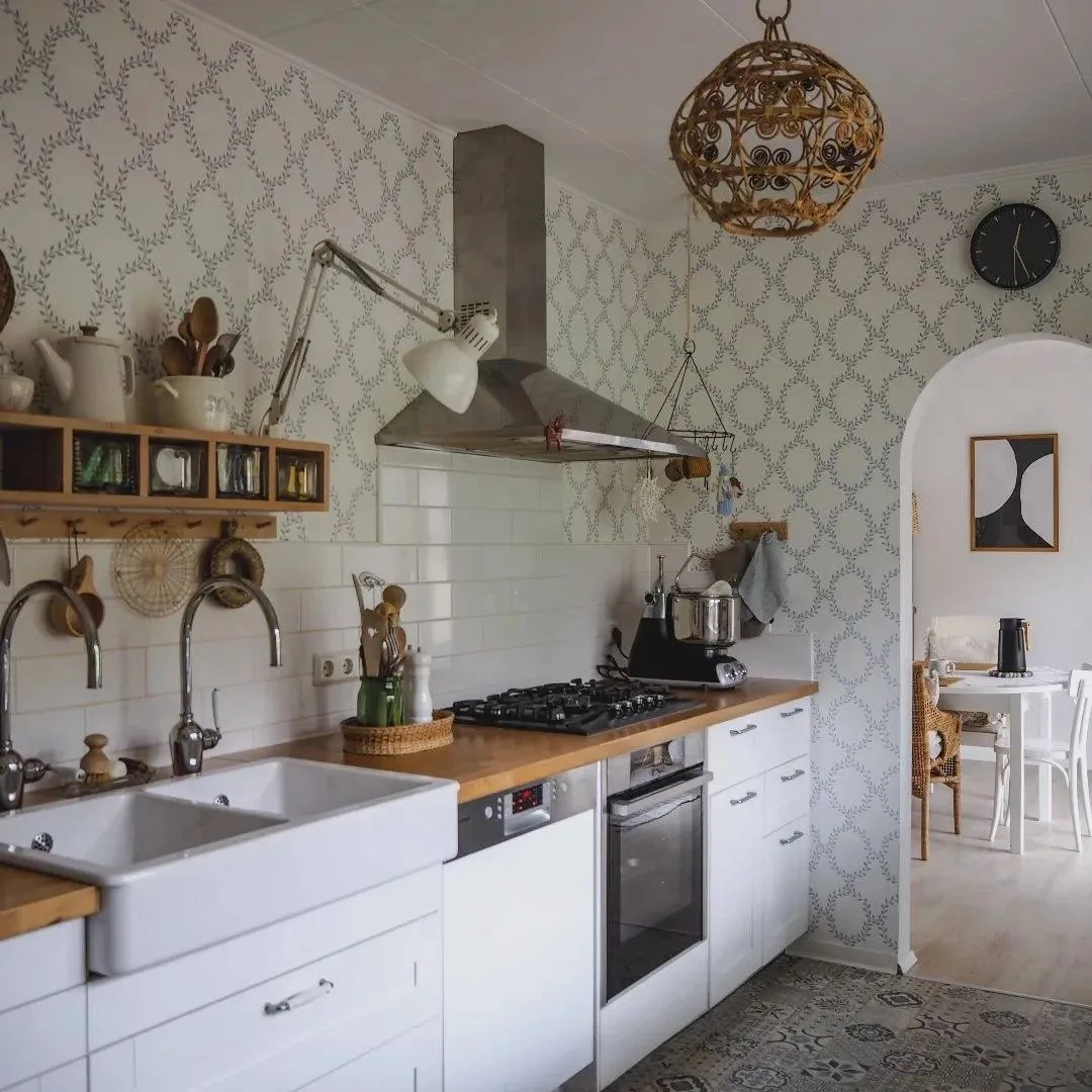 Мы восторге от того, как смотрятся эти обои! В них есть что-то неуловимо деревенское. И они хорошо сочетаются с клубничными обоями в кухонном шкафу!🌸