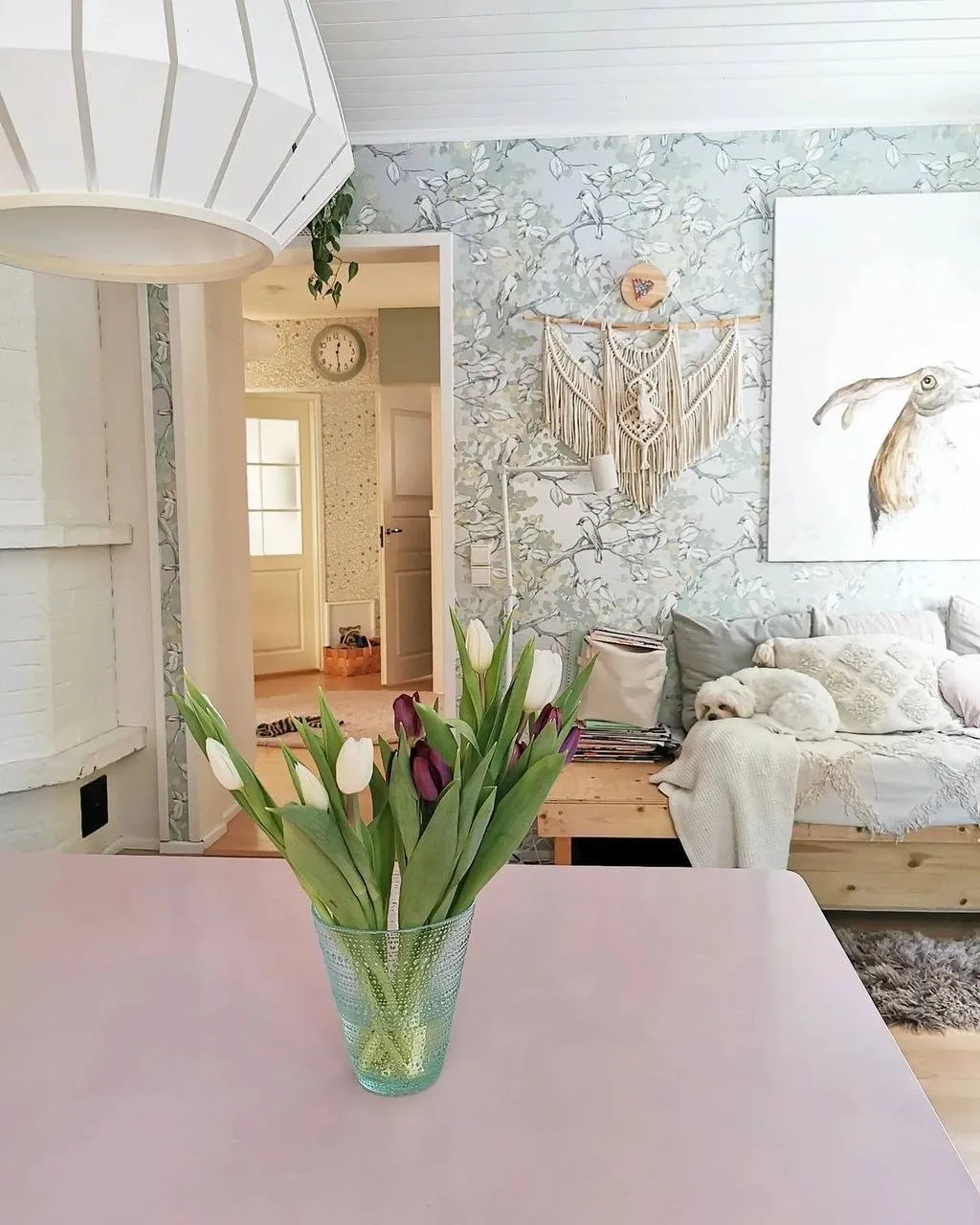 🌸🍃🍓Прекрасный финский дом, хозяйка которого обожает животных, красивую посуду и приятные пастельные оттенки. Сам интерьер выглядит очень уютно и нежно, с цветочными и растительными обоями и яркими акцентами в деталях
