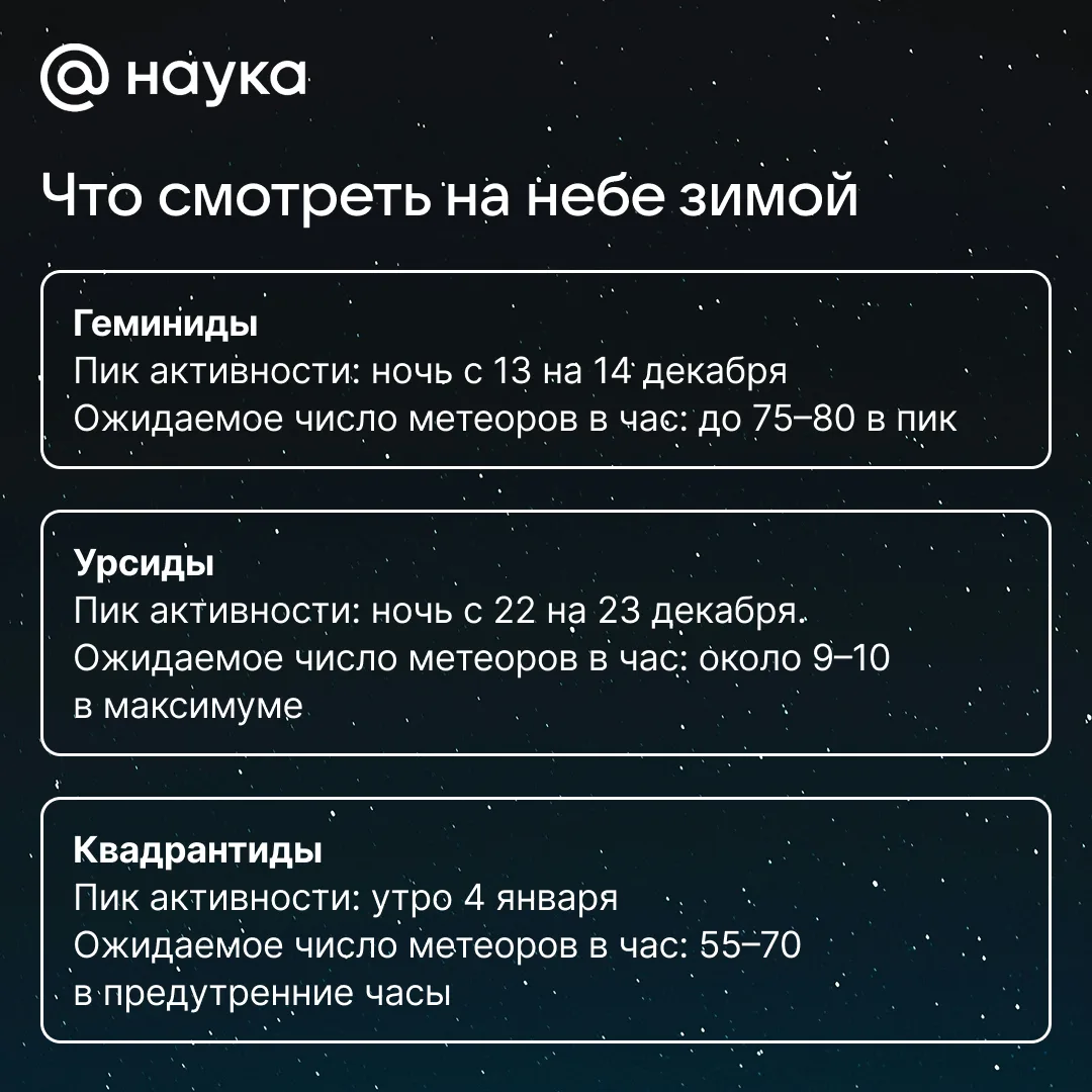 Зима — не повод пропускать астрономические события. Ведущий инженер обсерватории «Вега» НГУ Михаил Маслов порекомендовал выбрать места вдали от городской засветки и одеться потеплее, чтобы наблюдать зрелищные потоки — Геминиды, Урсиды и Квадрантиды.