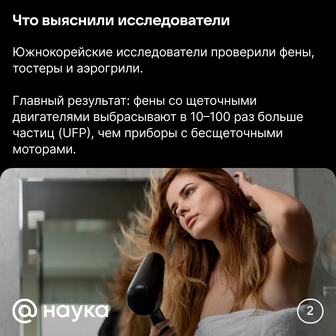Южнокорейские ученые выяснили, как фены, тостеры и аэрогрилли могут загрязнять воздух в квартире. Подробнее — в карточках 👆