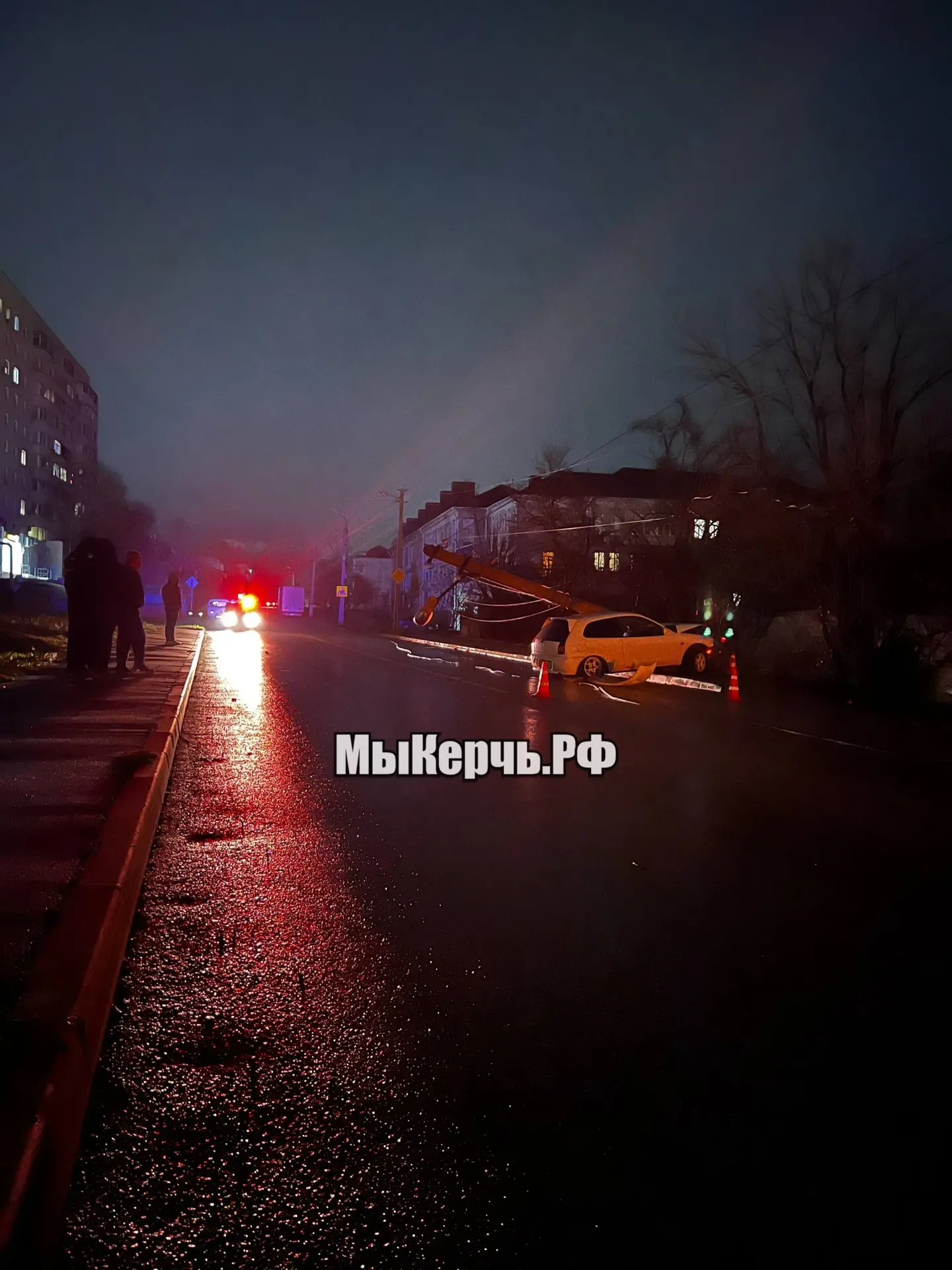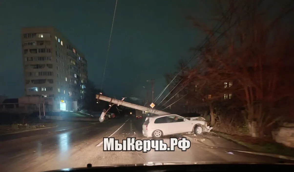 Водитель иномарки не справился с управлением на улице Ульяновых и врезался в опору освещения. Столб упал на машину. Пишет МыКерчь.РФ