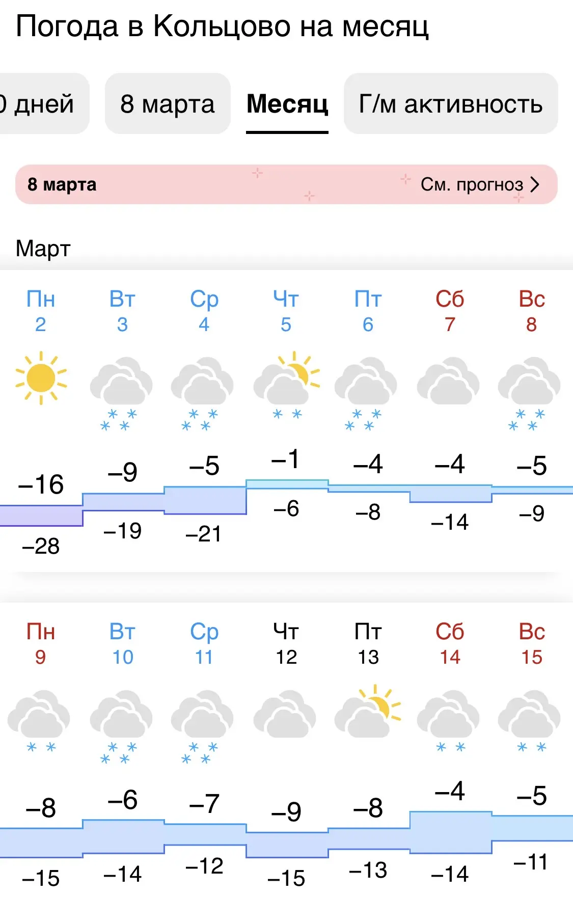 Судя по прогнозу на месяц: март - это все-таки у нас зимний месяц. В ближайшие 30 дней плюсовых значений не ожидается. Продержимся 💪